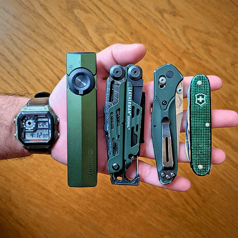 In EDC My go to carry April 4, 2026 even though I've got plenty of options, this setup seems to find its way into my pockets most consistentlyby WhoisDoctor1401 EDC Prev Post NKD x 2! An Atom to keep my Neutrons company, and a freebie QSP Leopard that’s surprisingly decent April 4, 2026 Next Post Saturday Stuff April 4, 2026 Related Posts How many fellow tool nerds were freaking out at that Project Hail Mary Scene? [SPOILER] April 5, 2026 Flat Carry EDC April 5, 2026 I love this combo! April 5, 2026 5 Comments AutoModerator 6 hours ago Thank you for posting to r/EDC! Include a detailed item list (make/model) within **1 hour** of submission. Lists can go in the title, a comment, or the image. Posts without lists will be removed. If you have already provided a list, not further action is needed, thanks | [FAQ](https://www.reddit.com/r/EDC/wiki/faq)*I am a bot, and this action was performed automatically. Please [contact the moderators of this subreddit](/message/compose/?to=/r/EDC) if you have any questions or concerns.* sbernard 6 hours ago good for jungle. do you have a separate desert edc? WhoisDoctor1401 6 hours ago Watch: Casio AE-1200WH-3BVFlashlight: Olight ArkpProMultitool: Leatherman SignalKnife: Benchmade 940 OsborneSAK: Victorinox Pioneer X Mari__Consoy 6 hours ago I’m green with envy. Terrific set up SlimeTribe 5 hours ago Your watch looks uncomfortably tightWrite A CommentYou must be logged in to post a comment.