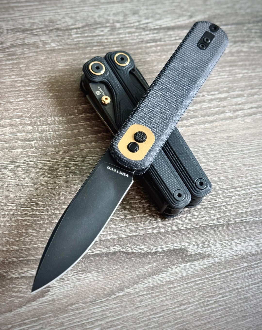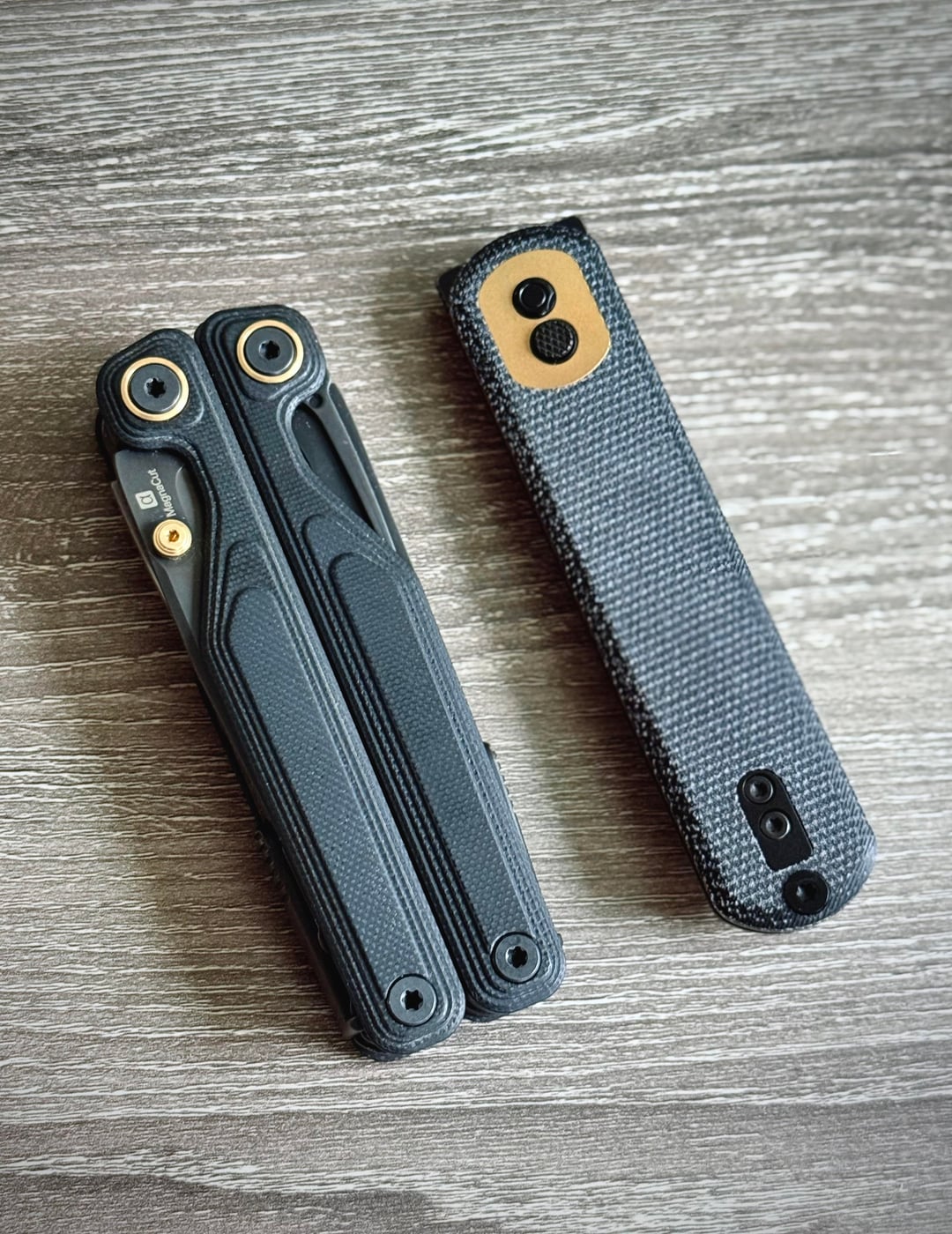 Vosteed Corgi (Micarta) and Leatherman Wave Alpha (G10).