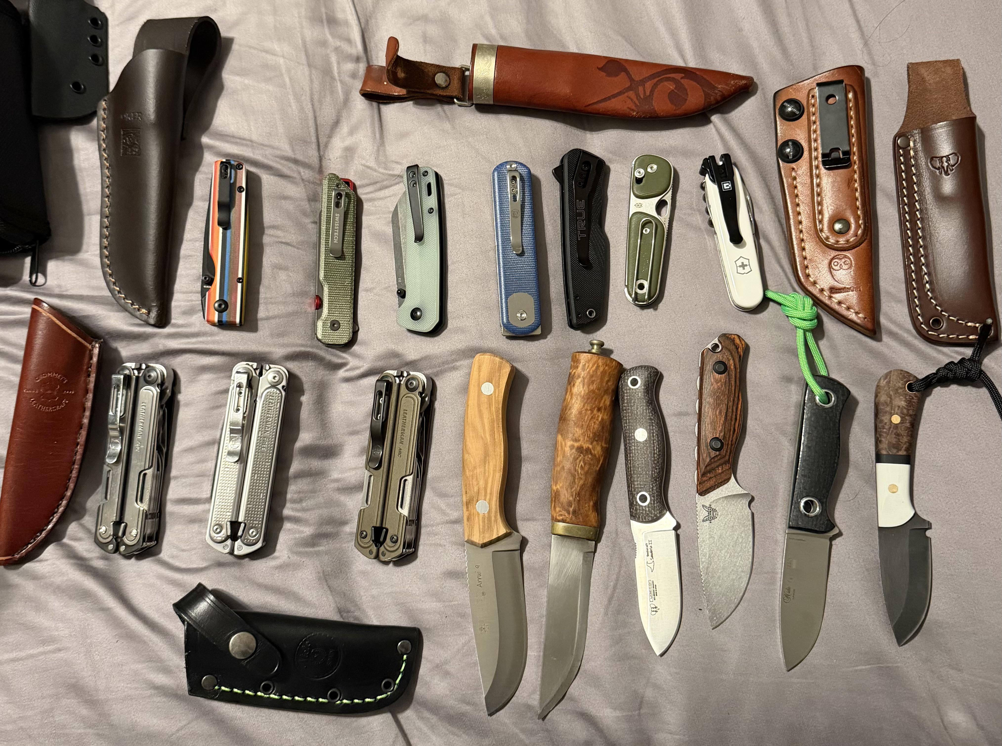 I’ll try to list all that I can remember starting at the top left: – Keizer Serape – Swiss Tech folder from Walmart – QSP Pinguin – Vosteed Corgi Sheepsfoot – gifted knife – do not know brand – James brand folder – Beard & Owl Sheath – Leatherman Arc – Leatherman p2 – Leatherman Arc Copper – Joker Fixed blade – Knife I bought in Norway 26 years ago – Cudeman Mini – Benchmade Hidden Canton – Nieto Tesca Mini – JR’s Knifes