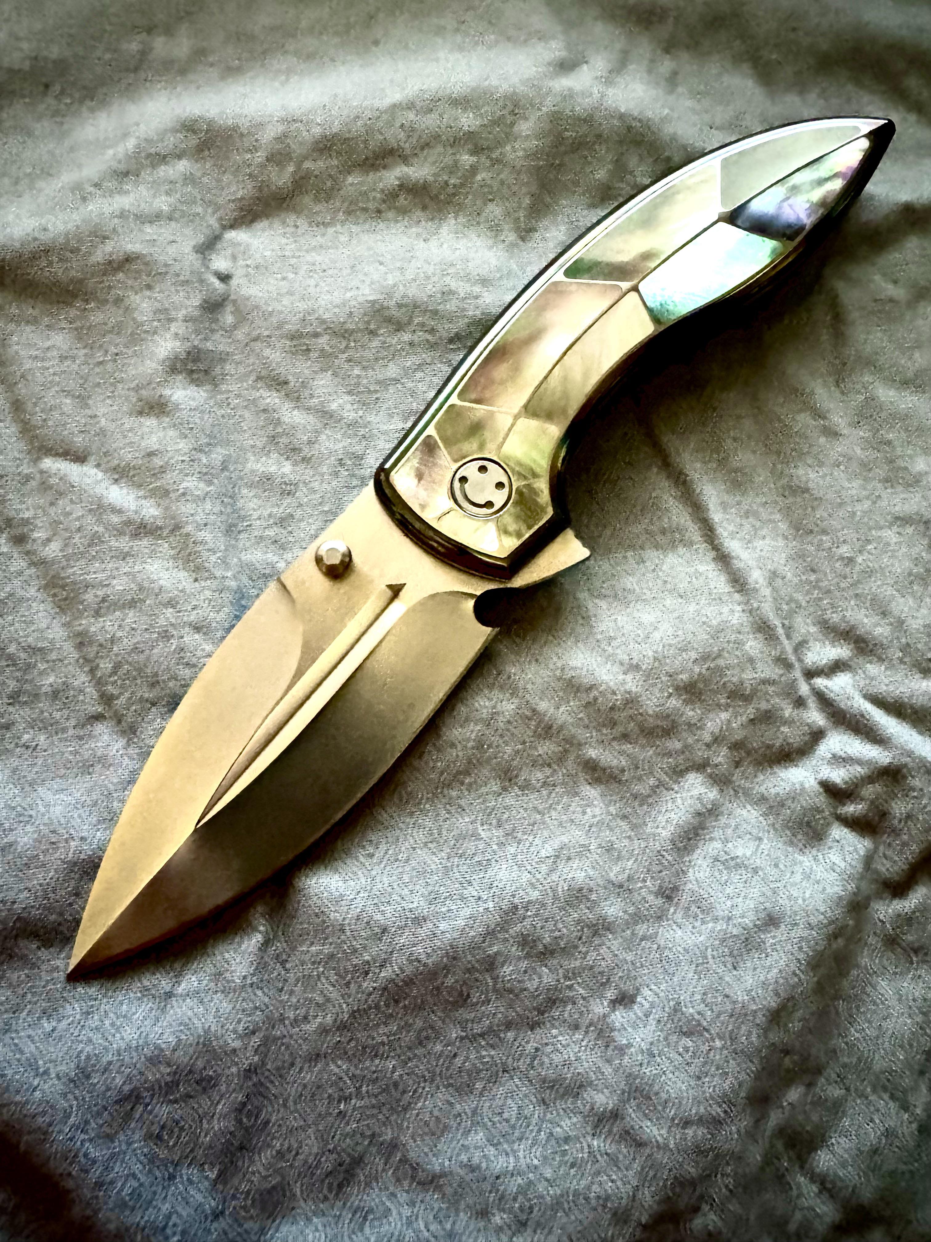 This is one of the most beautiful knives I have ever seen. M390 blade, Zirconium handle, Mother of Pearl inlay. It took 4 months to get it! $400.00 US ❤️