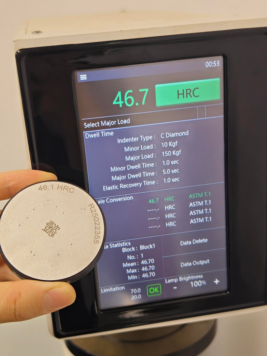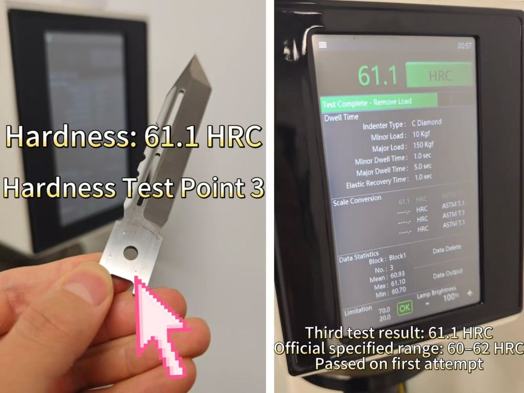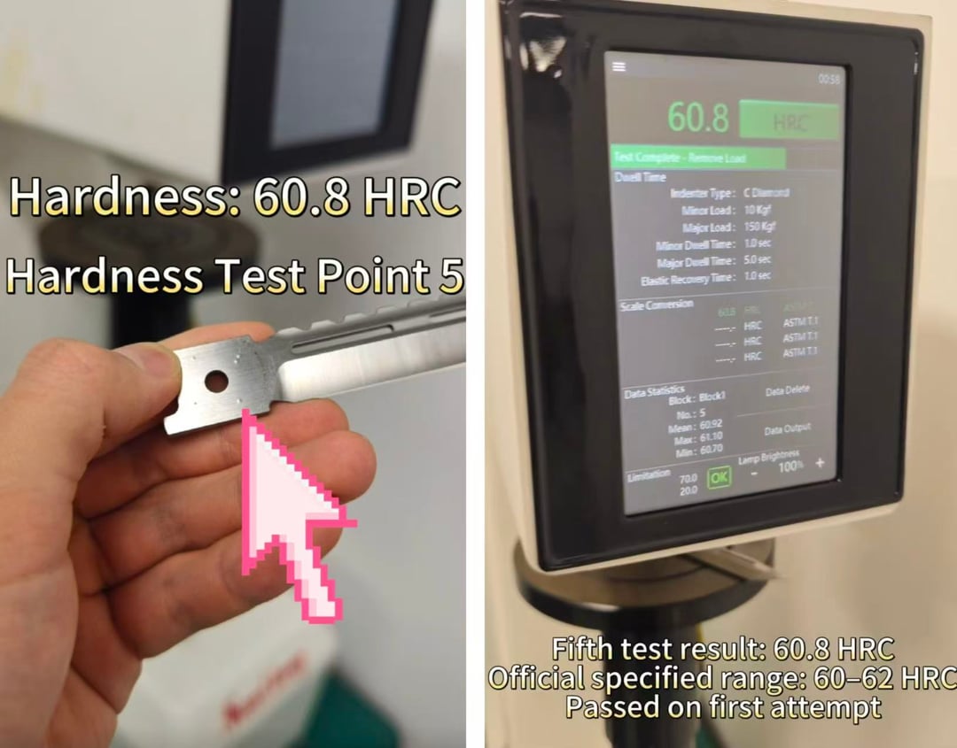 When our first batch of products came out, some users questioned why the hardness did not reach 64 HRC. Our explanation at the time was: **60–62 HRC is already an acceptable range**. As this is a brand‑new material, we followed the product data sheet provided by Crucible Industries LLC and adopted a more conservative heat treatment protocol combined with liquid‑nitrogen cryogenic treatment.