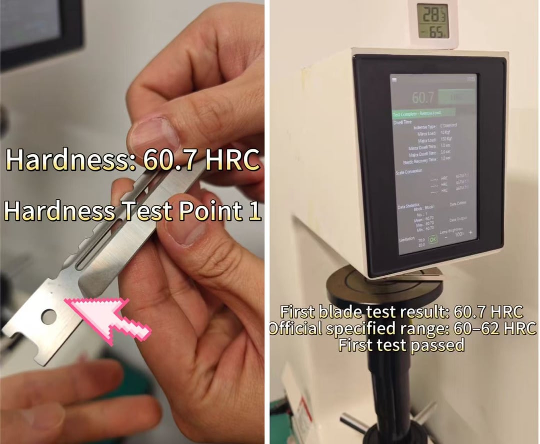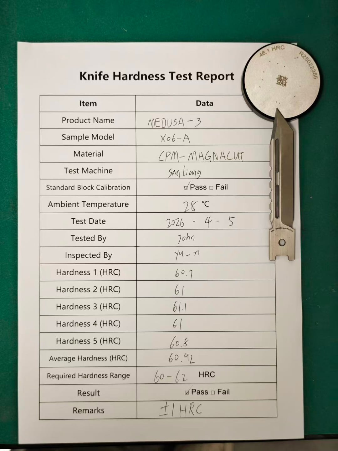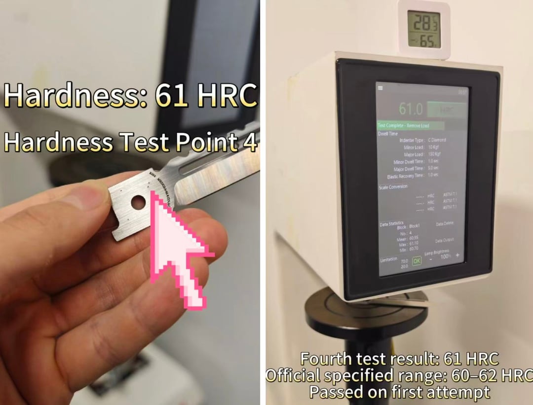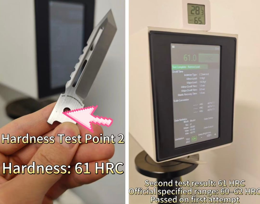 Regarding the measured hardness of [58.5 HRC] on a CPM‑Magnacut knife by some friends, we would like to provide the following official explanation: