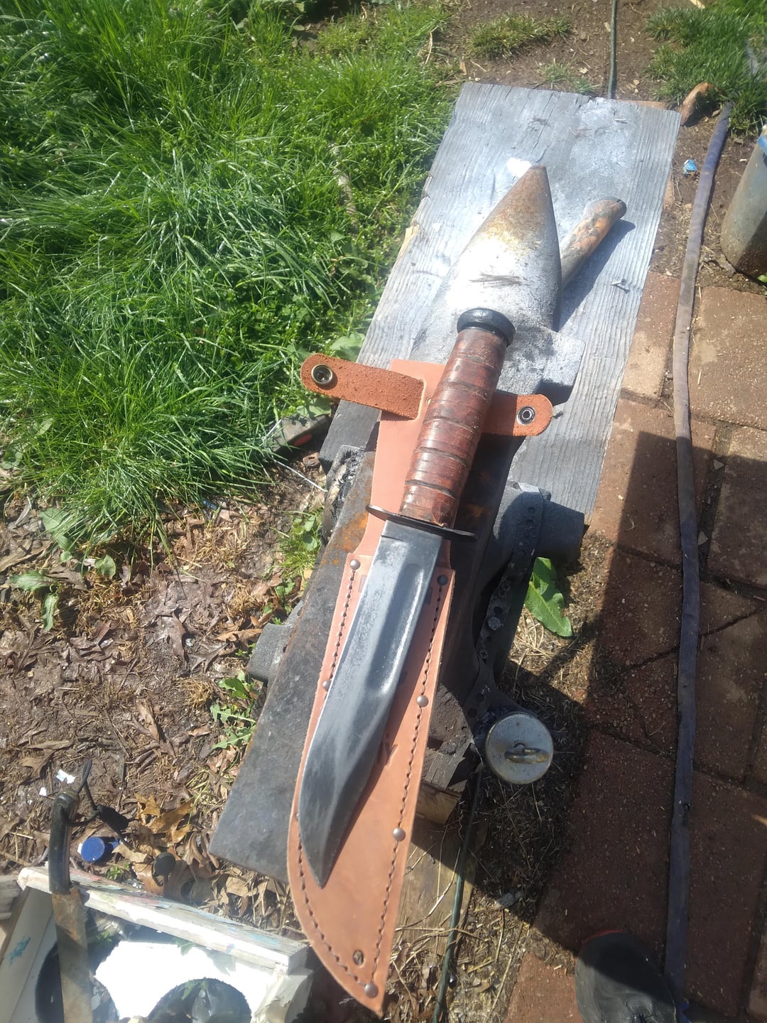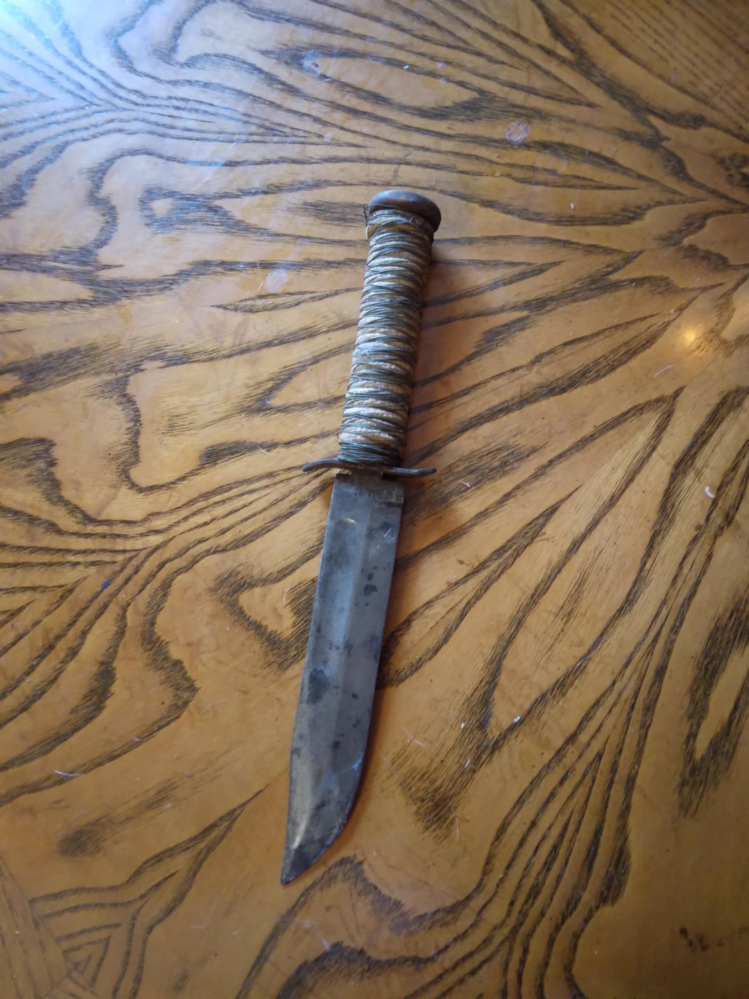A friend of mine had an old “kbar” that he had inherited from his uncle who carried it in Viet Nam. Somehow between here and there all the guard was replaced, the old stacked leather handle likely dry rotted off and was replaced with cord and wire, and the blade was extremely rusted and stained. I l