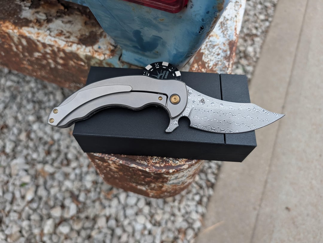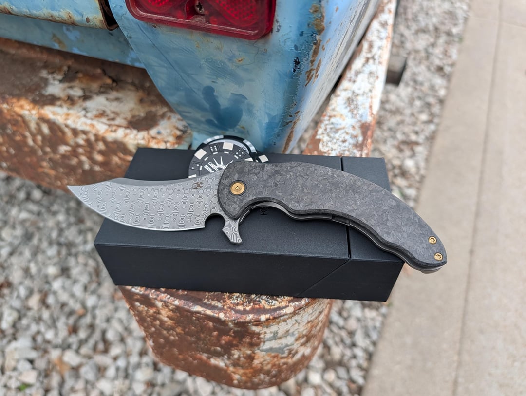 The Pocket Sword Reimagined. The Kansept Gilgamesh is a overbuilt elegance. Designed by Andreas Goltz, this isn’t a knife that tries to disappear in your pocket. The combination of the Damascus blade and shred carbon fiber creates a high-end, organic look that contrasts beautifully with the industrial, beadblasted titanium frame. It feels like a premium artifact. At over 6 ounces and nearly 9 inches open, this is a heavyweight if you prefer lightweight, deep-carry foldes, the Gilgamesh will feel like a boat anchor. My biggest gripe is no lanyard hole.