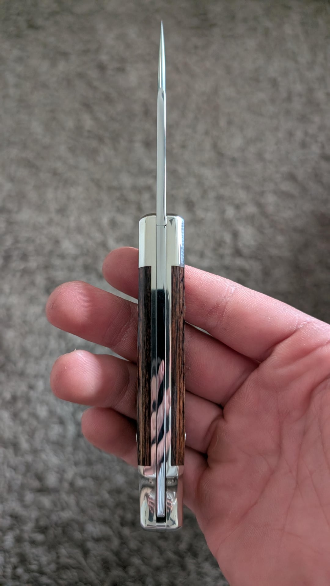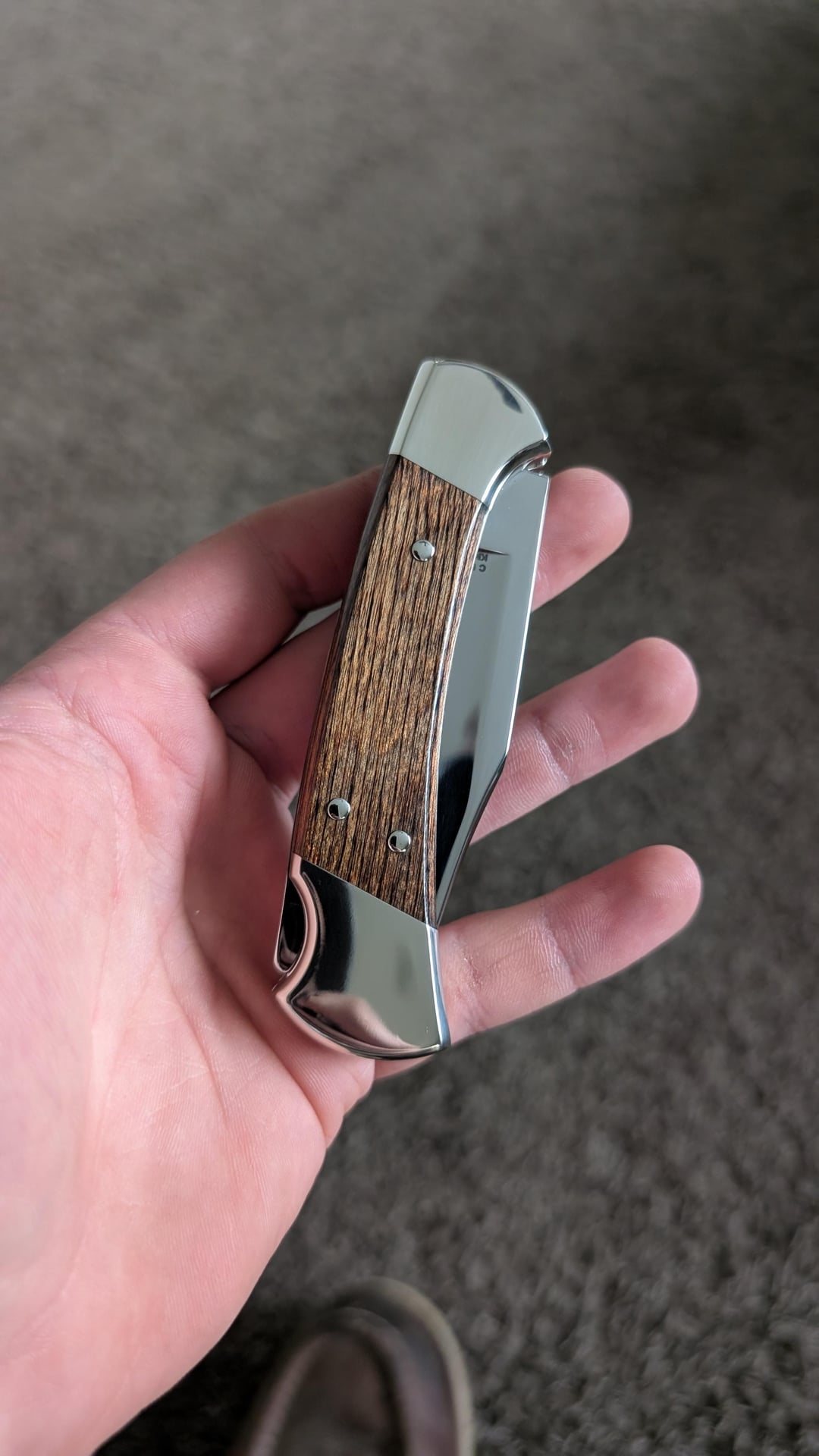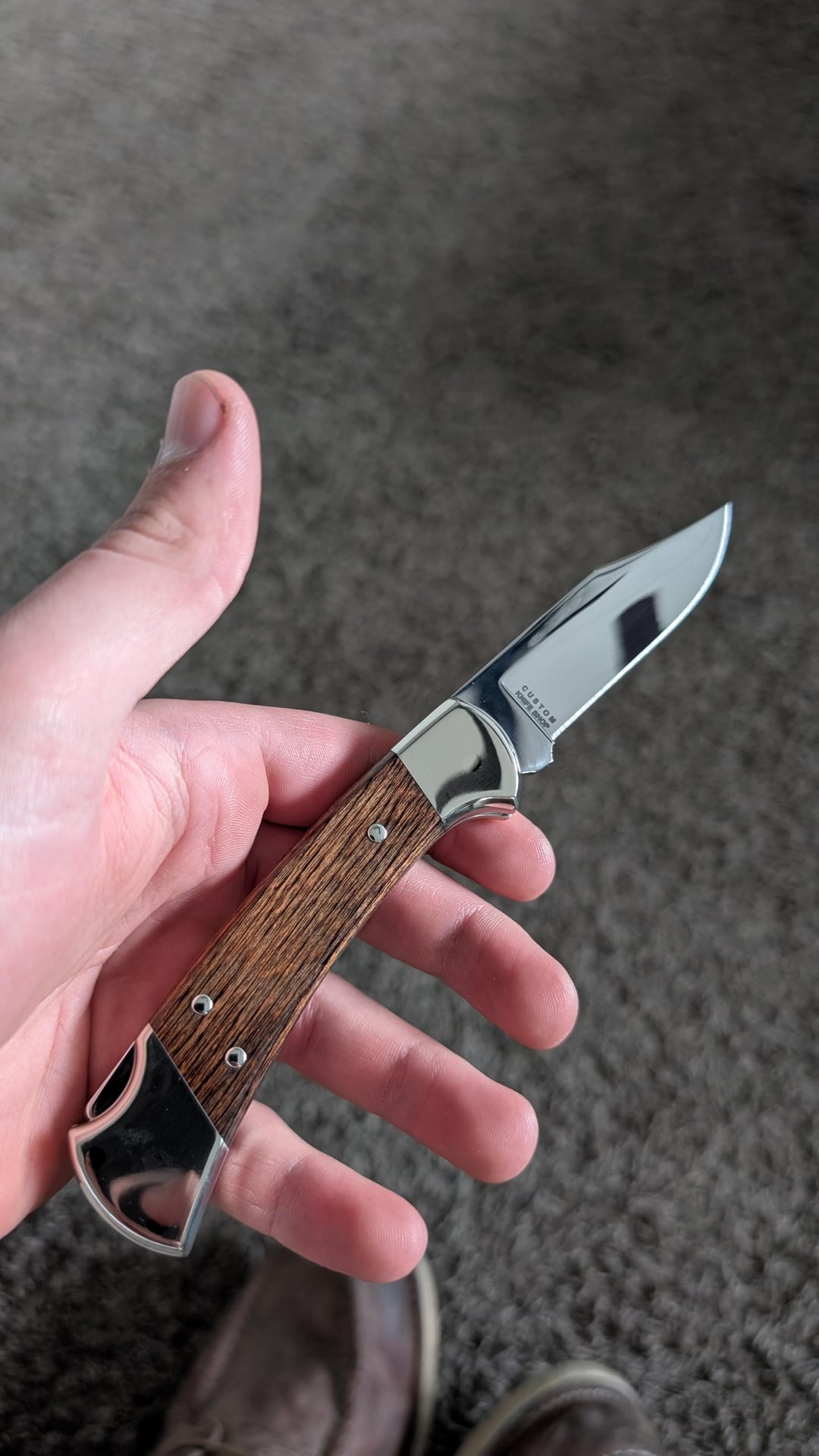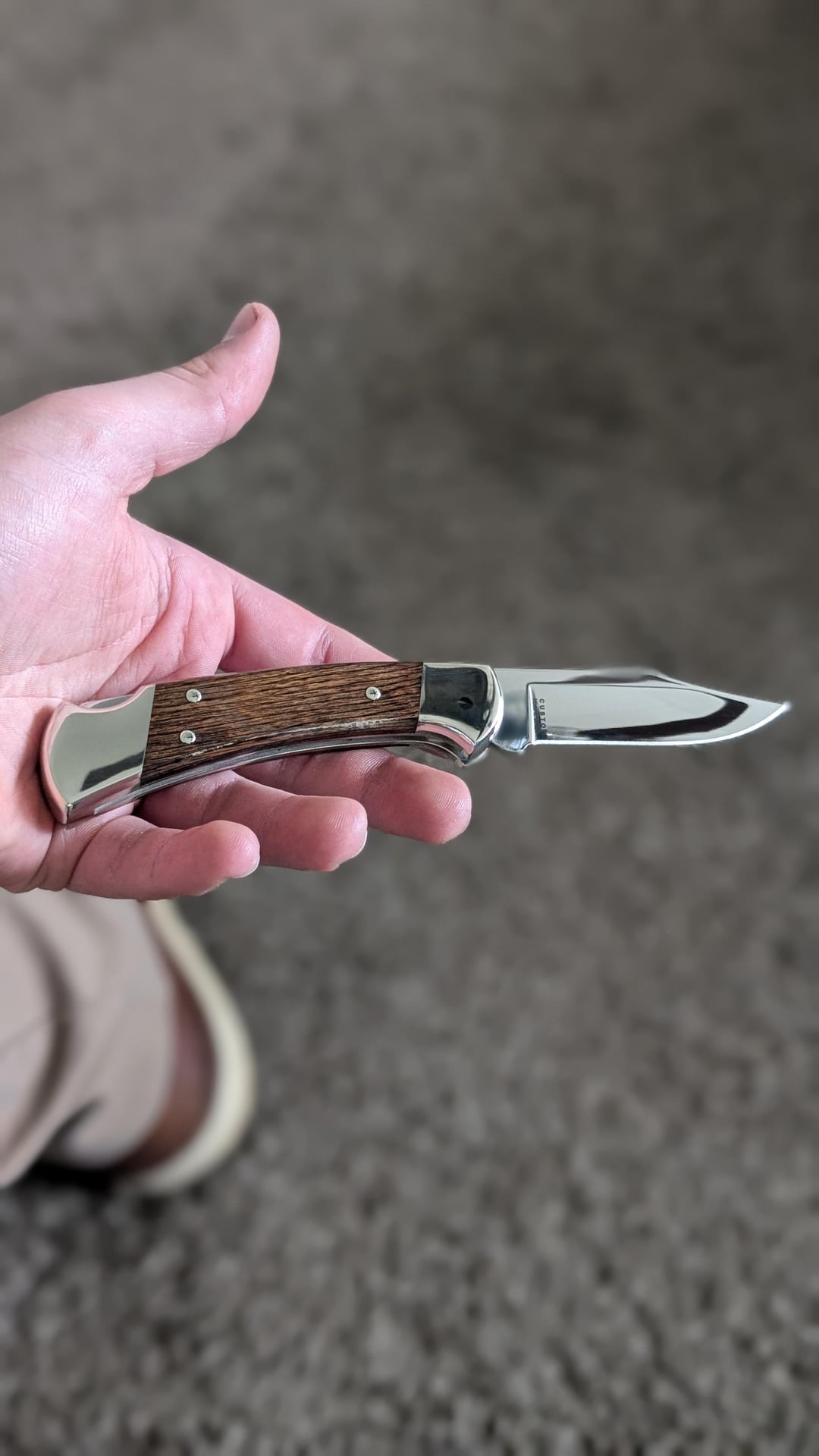 back in late January I ordered a custom buck 112, I went with mirror polished blade, polished nickel bolsters, walnut scales, rivets, and the brown leather sheath, fast-forward almost 10 weeks it has finally shown up, I'm super happy with the way it turned out! it's a bit of a fingerprint magnet though. 😂
