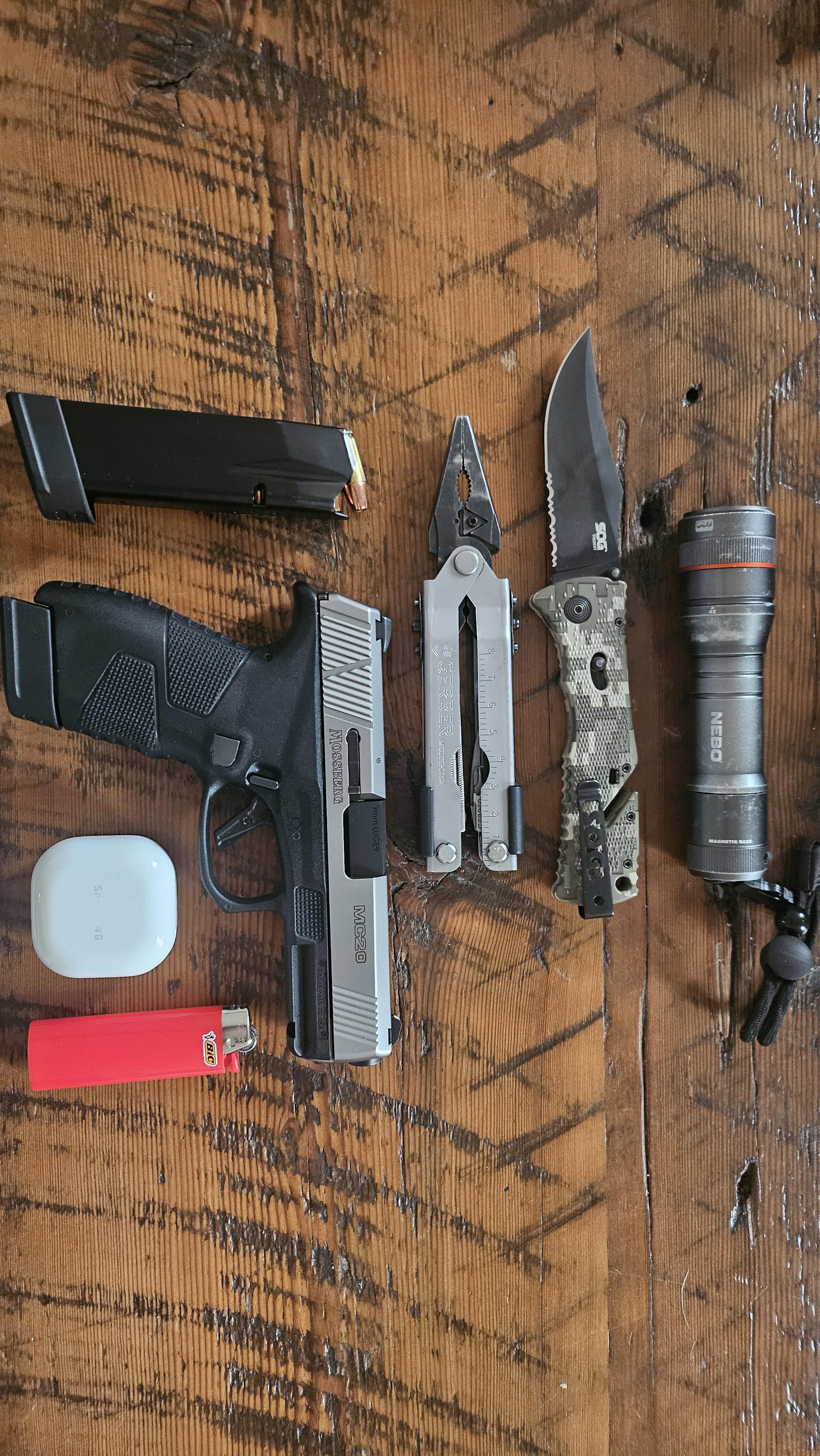 Mossberg MC2C with a 16 round magazine, spare 16 round magazine, Samsung galaxy buds fe, Bic lighter, Gerber mp600 pro scout, Sog Trident, Nebo newton 500.