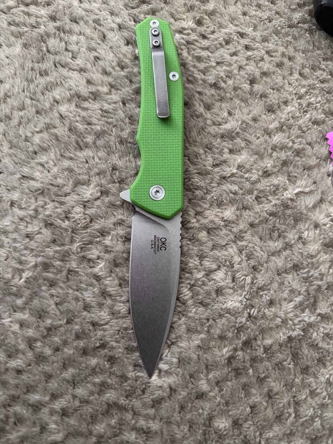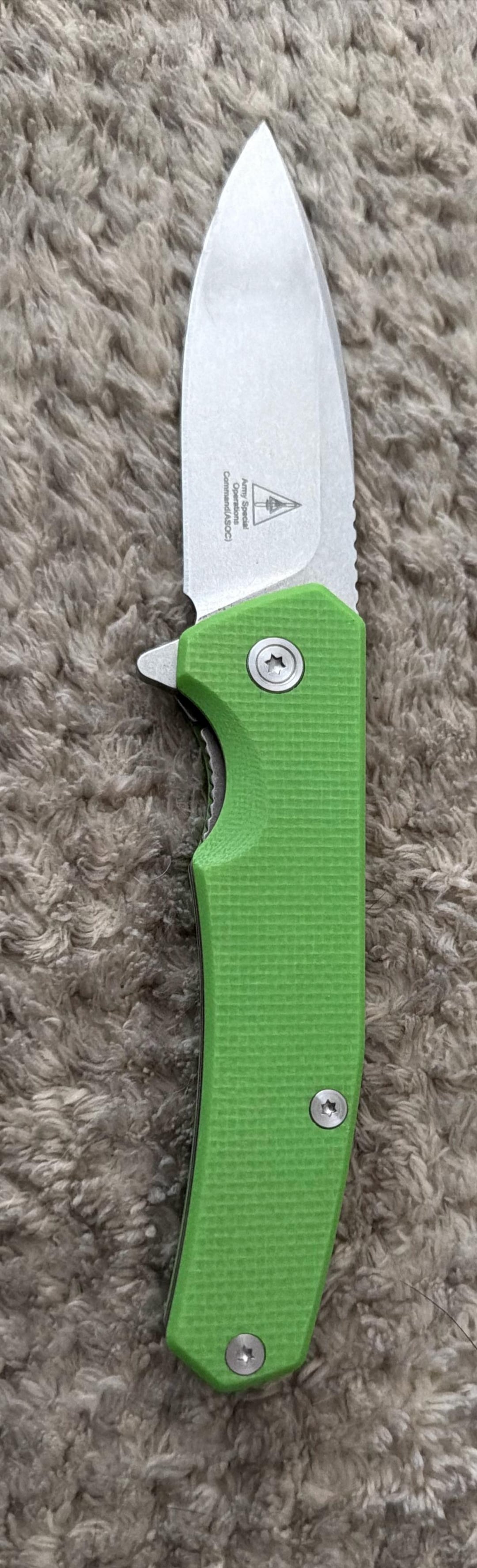 It’s marked “OKC Ontario MagnaCut USA” on one side of the blade. The other side has a triangle Army Special Operations Command (ASOC) logo with “Commend(ASOC)” under it.