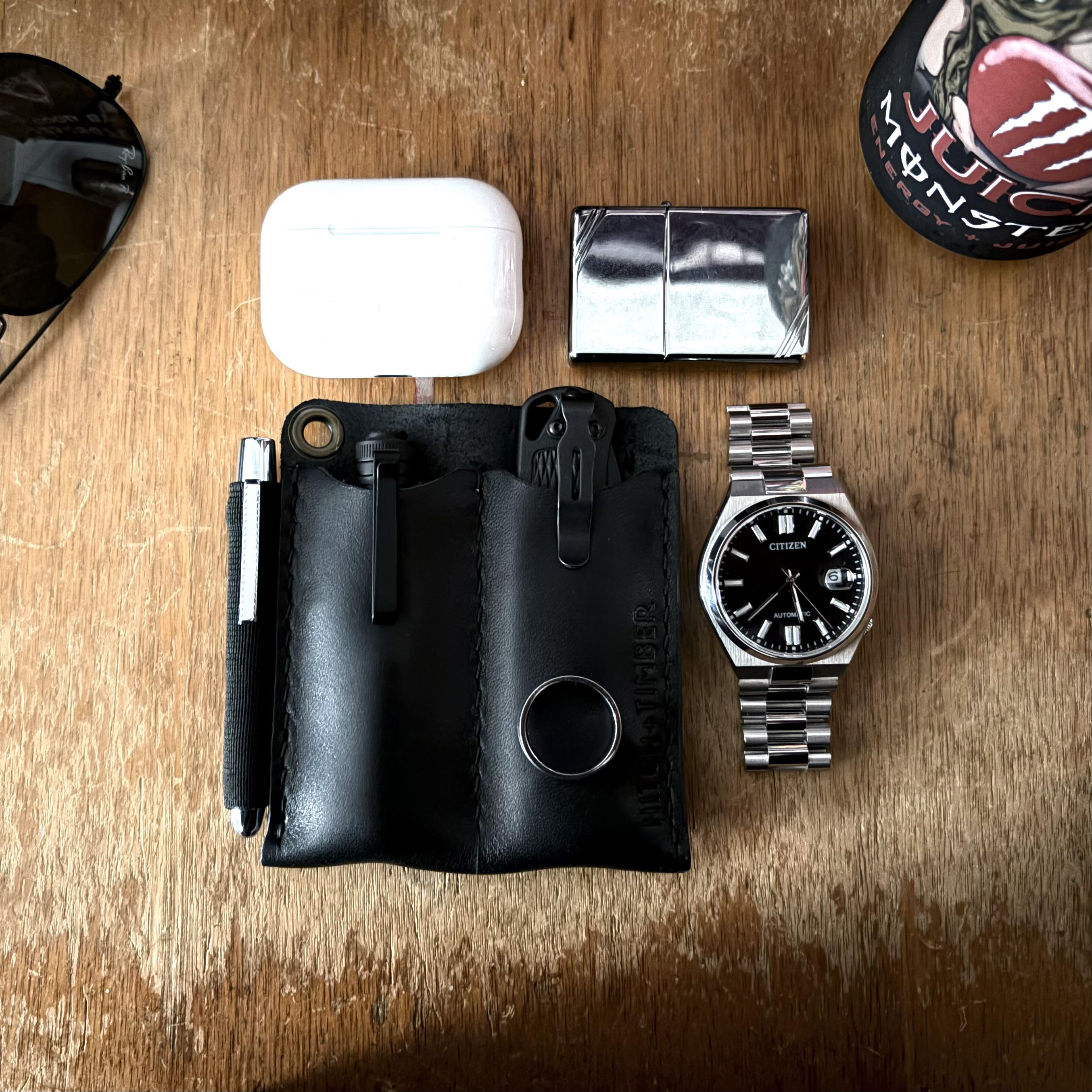 Hitch + Timber Slip. AirPod Pro 3. Zippo. Fisher Space Pen. Streamlight Microstream. Benchmade Bugout. Citizen Tsuyosa. Wedding Ring.