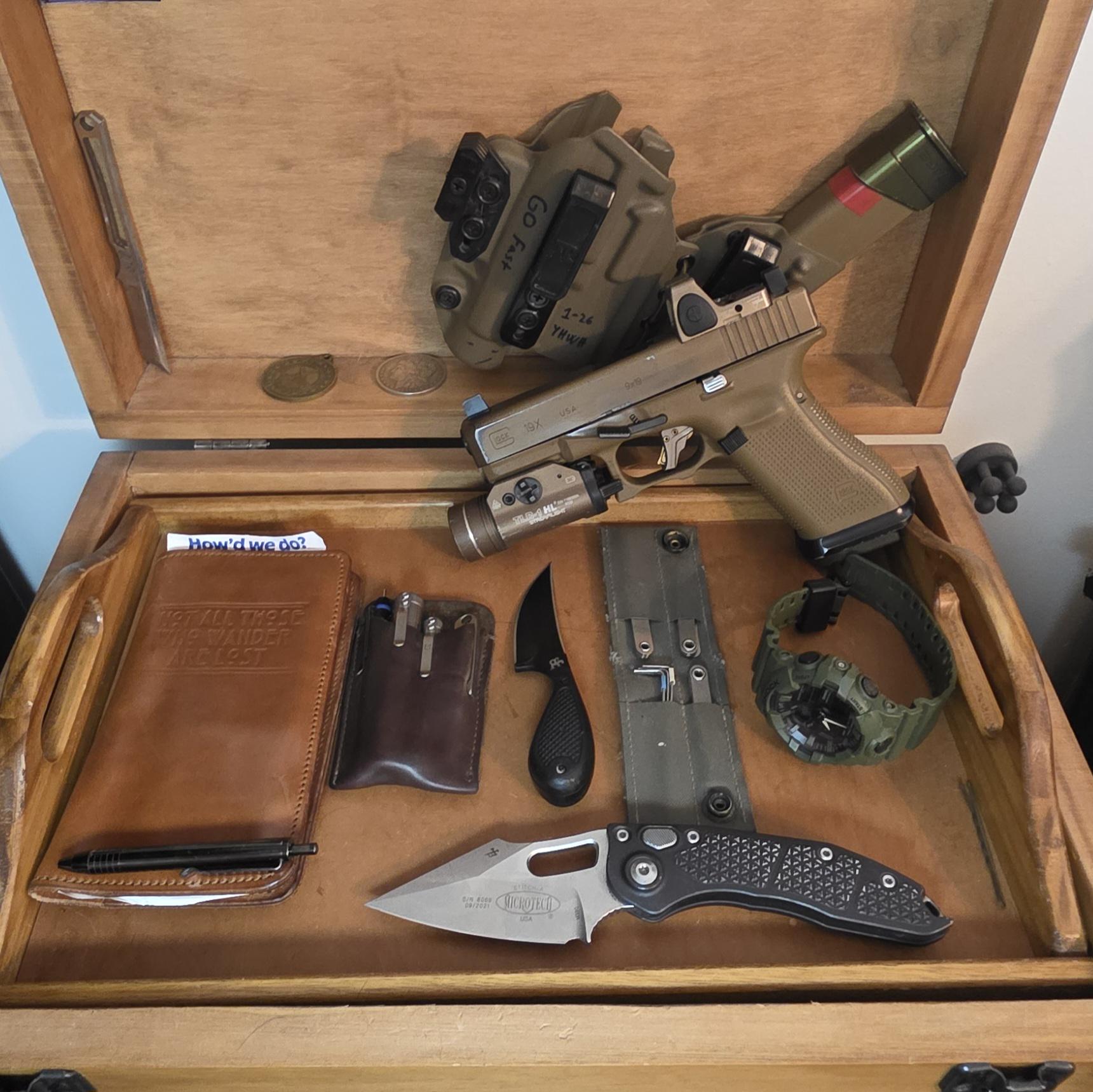I maintain a consistent everyday carry (EDC) setup, utilizing the same holster for both my 19c and 19x firearms. For defensive tools, I alternate between my Shivworks clinch pick and the Tops El Pionero. My pocket knife rotation includes the Stitch UTX70 and a Benchmade 85. This carrying methodology has been consistently applied since 2018, with the only modifications being the generation of the firearm, my wallet, and my lock picking kit.