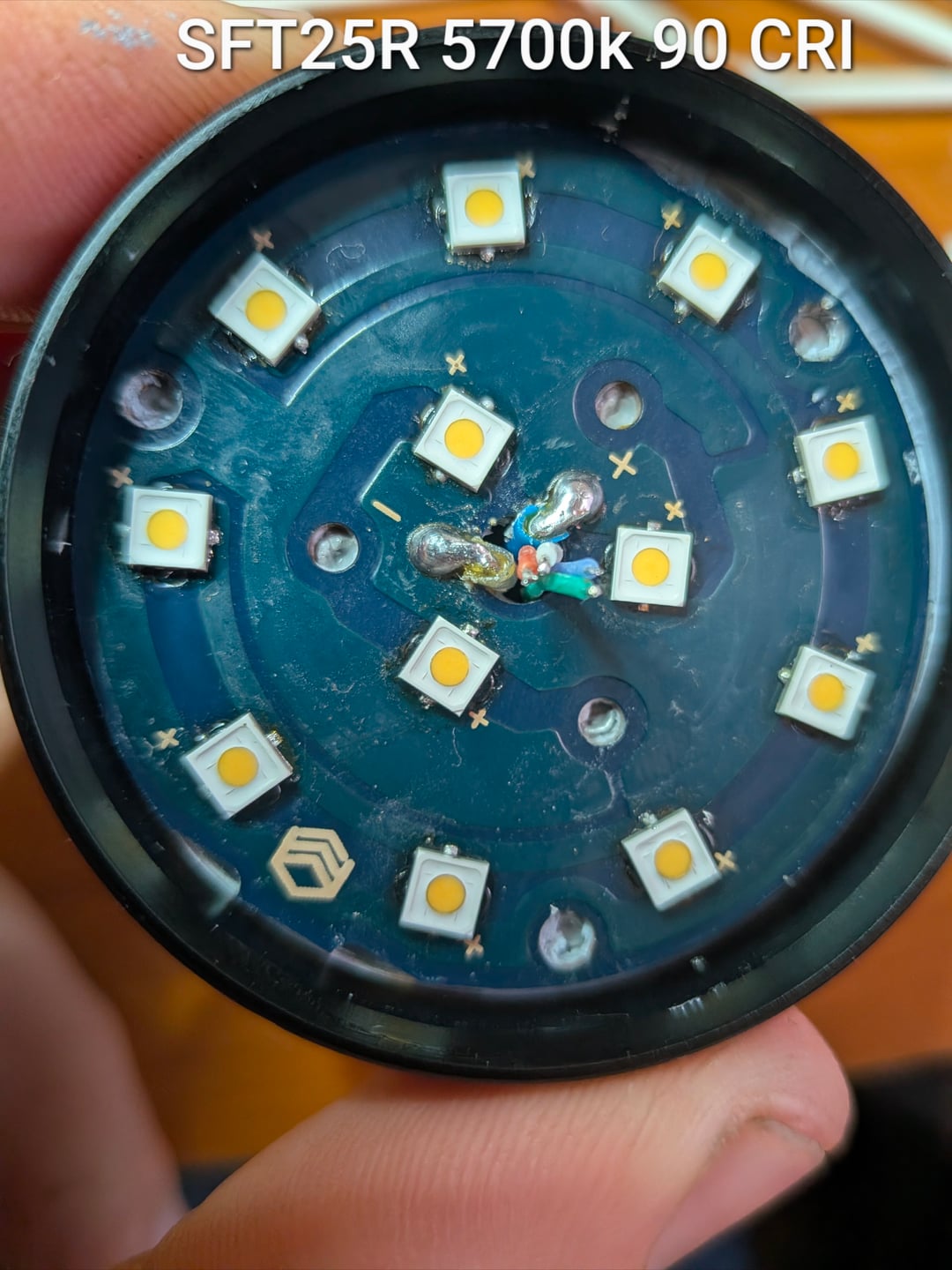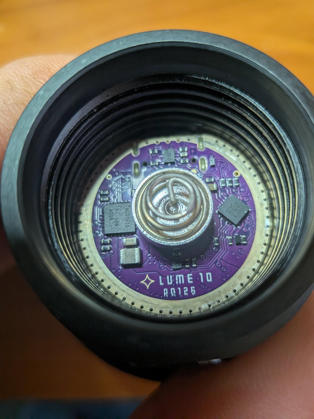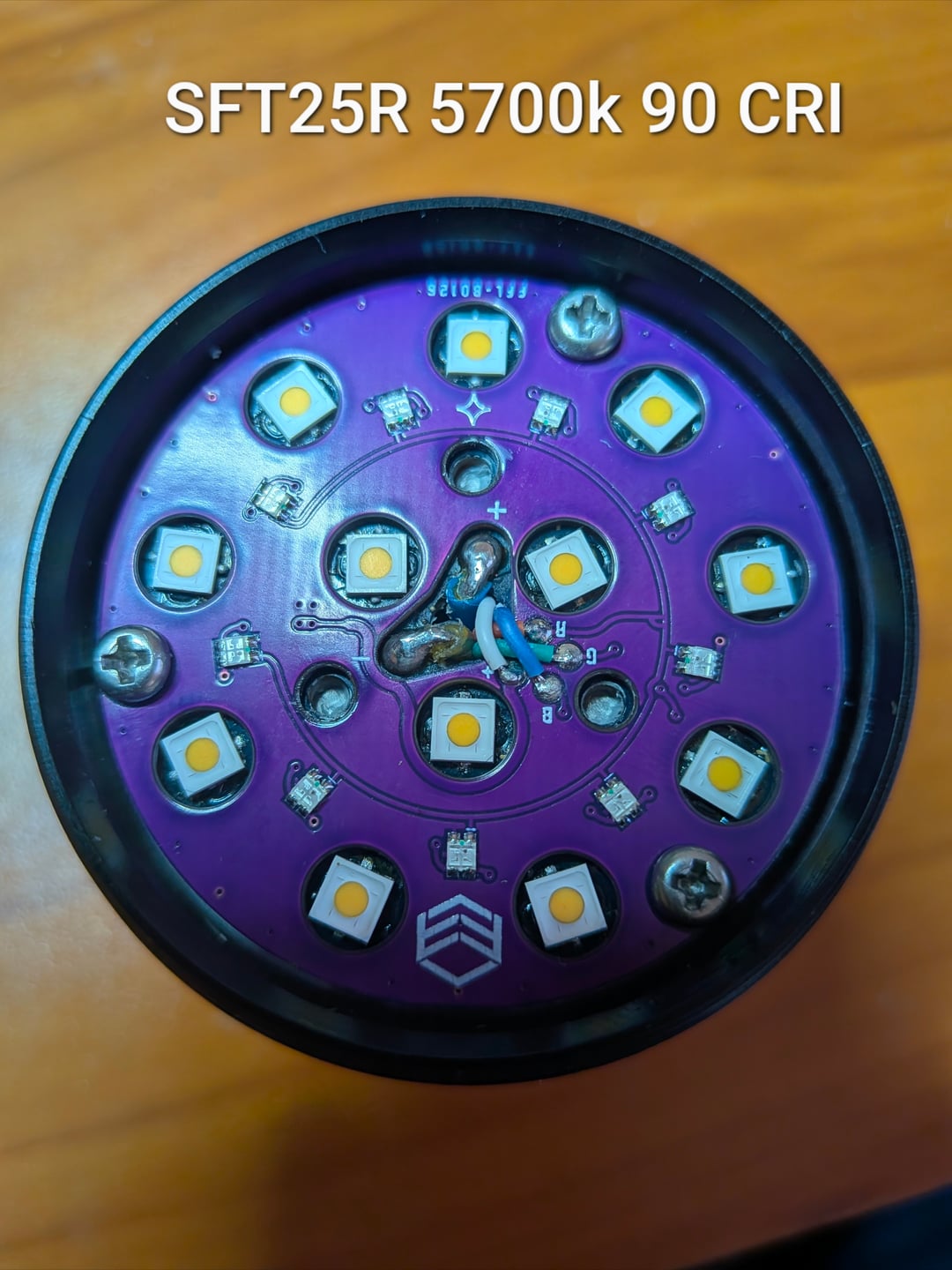 I swapped in SFT25R 5700k 90 CRI and FFL351A 4500k. The guts are largely the same as the E12R, so I would imagine old MCPCBs and optics appear compatible too. It looks like the tail spring has a button contact upgrade. … and obviously Lume10.