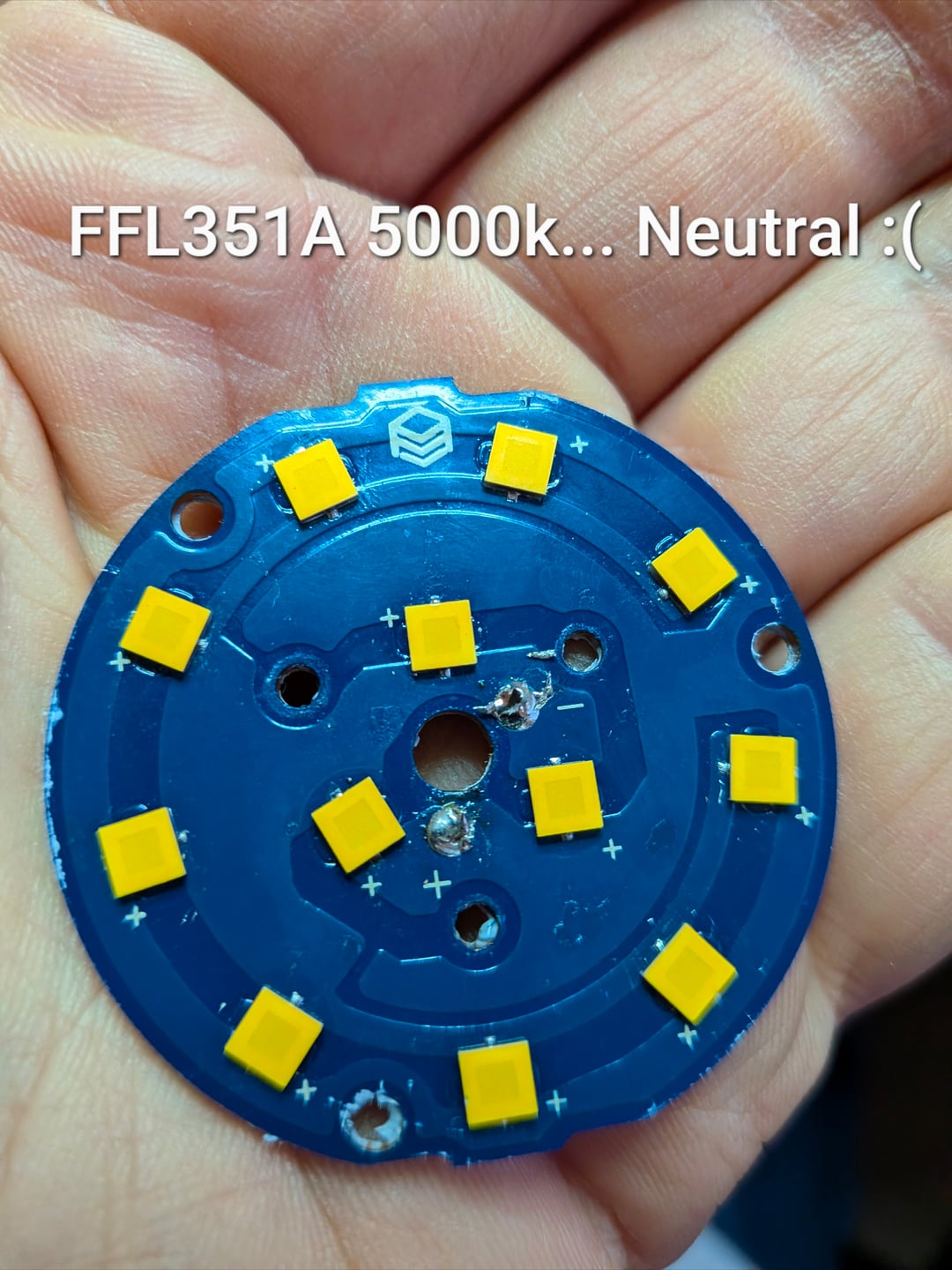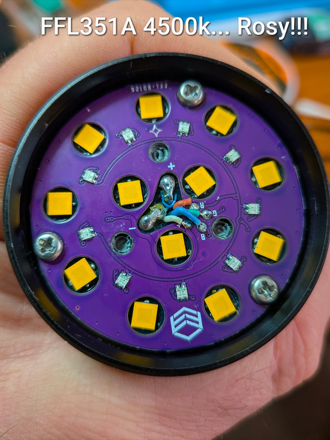 The FFL351A 4500k rosy bin is special. It is a JLHawaii exclusive. This was the second run that is actually close to around 4300k-4400k, whereas his first run which was not quite as good was closer to 4900k. These are stunning and the first time I have modded them into anything. I like these more than the 3700k rosy bin, which I have also tried mixing with the 4900k to produce a similar CCT, but it didn't come out quite this perfect, although still nice. This JLHawaii 4500k is my favorite FFL351A bin, no contest.