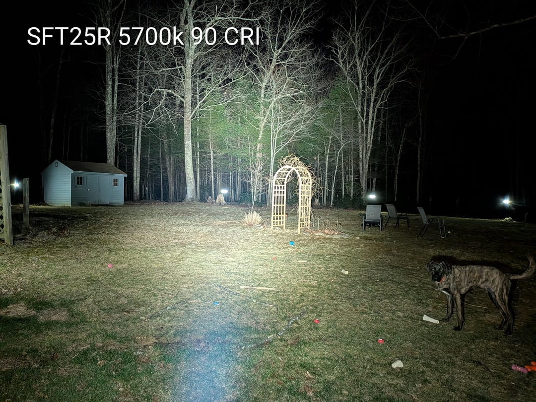 The SFT25R 90 CRI is not quite as throwy as the original 70 CRI, but still more than the FFL351A. It seems to outthrow my E04 with SFT40 4000k on turbo, and look better while doing it.