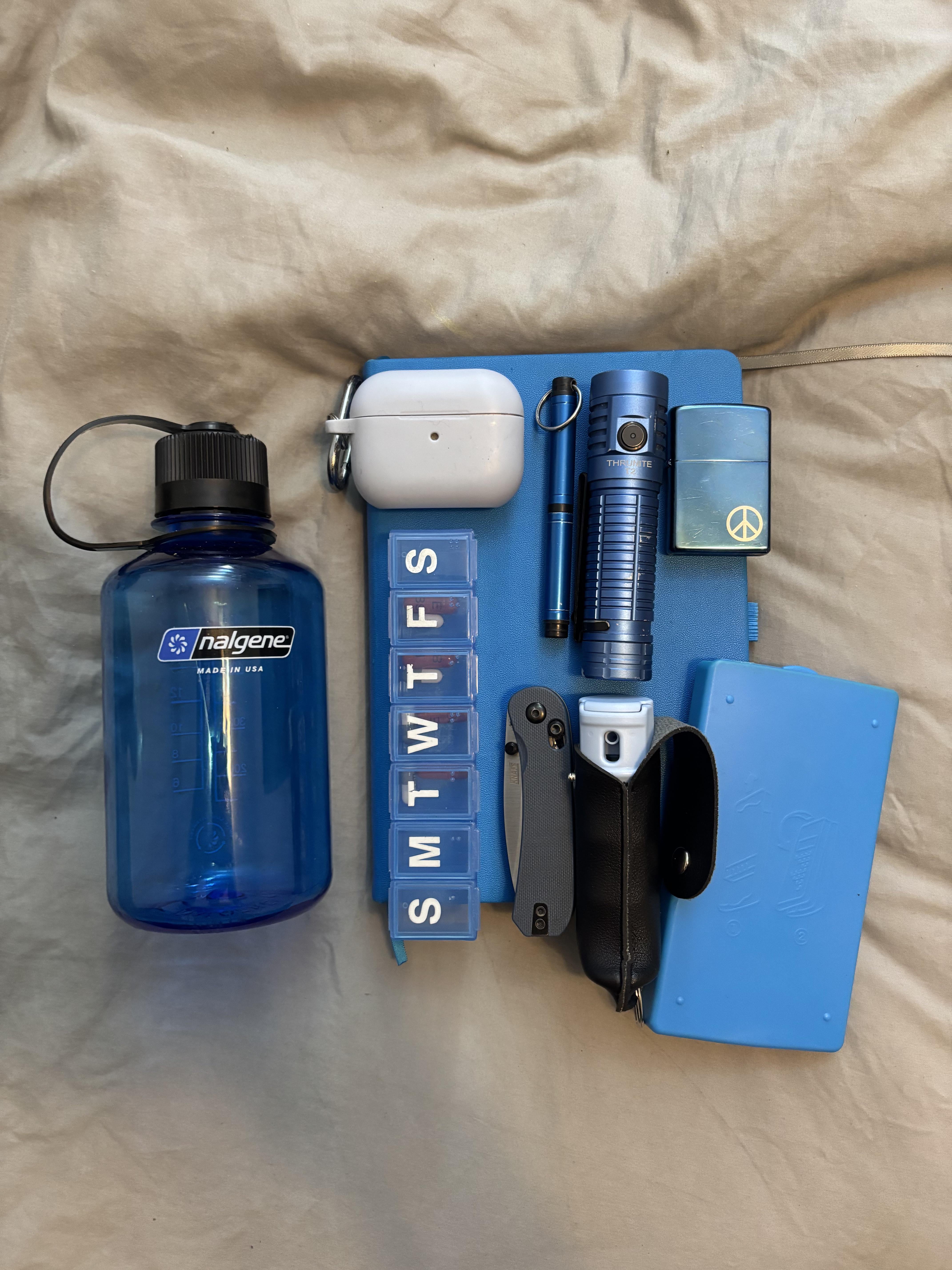 In EDC blue blue blue April 7, 2026 Nalgene water bottleipod pro 2Thrunite T2zippo brutane insert lightercalculatoreffexor 187mgsabre pepper spray by GaryBlach EDC Prev Post I’m a simple guy I guess April 7, 2026 Next Post Got myself a custom leather sheath for my Izula April 7, 2026 Related Posts Weekend Carry – Small Town, 12 Acre Plot April 11, 2026 Steel Pocket Pen Options April 11, 2026 I like black. 37m entrepreneur/engineer. April 11, 2026 1 Comment AutoModerator 4 days ago Thank you for posting to r/EDC! Include a detailed item list (make/model) within **1 hour** of submission. Lists can go in the title, a comment, or the image. Posts without lists will be removed. If you have already provided a list, not further action is needed, thanks | [FAQ](https://www.reddit.com/r/EDC/wiki/faq)*I am a bot, and this action was performed automatically. Please [contact the moderators of this subreddit](/message/compose/?to=/r/EDC) if you have any questions or concerns.*Write A CommentYou must be logged in to post a comment.