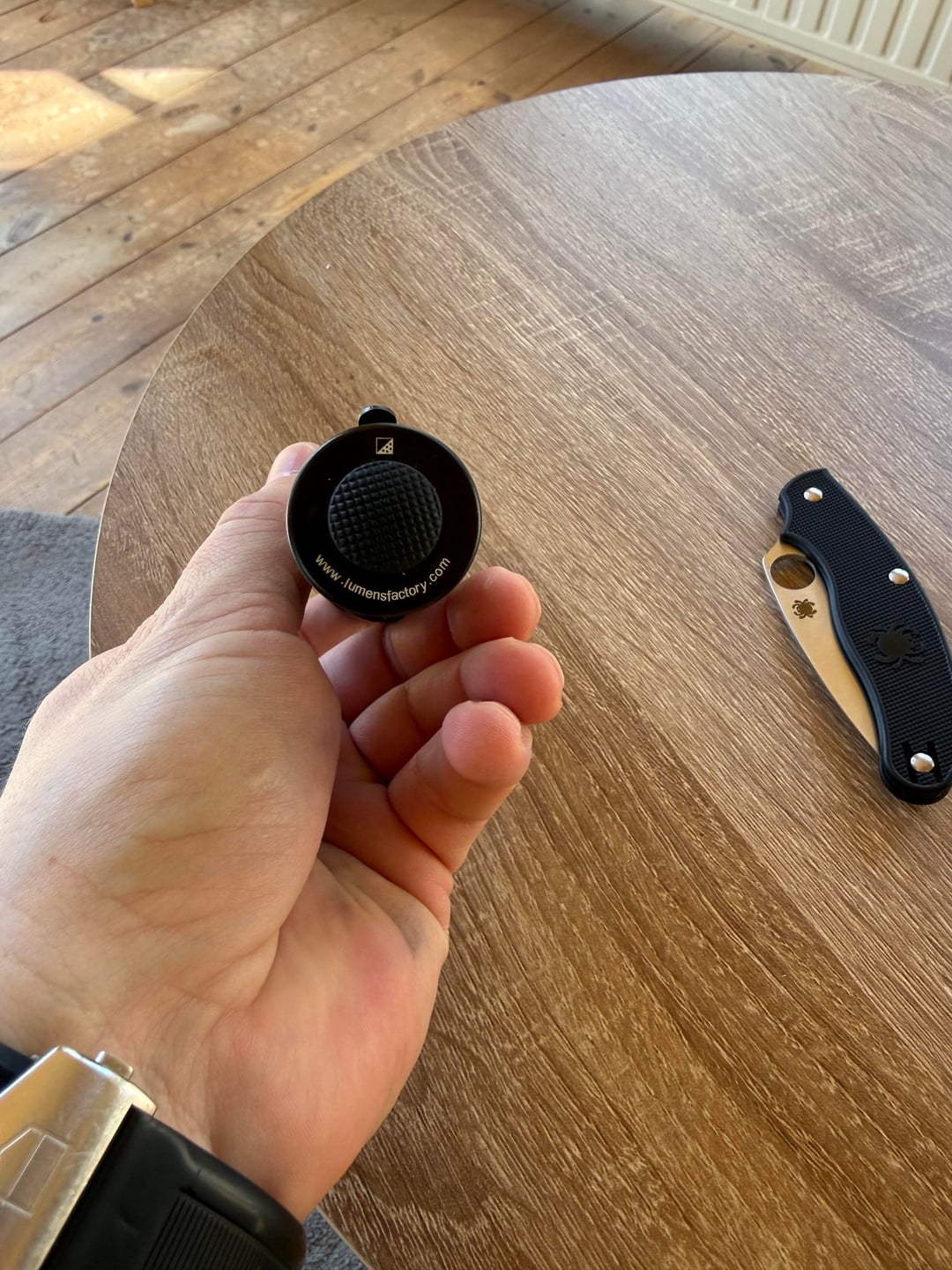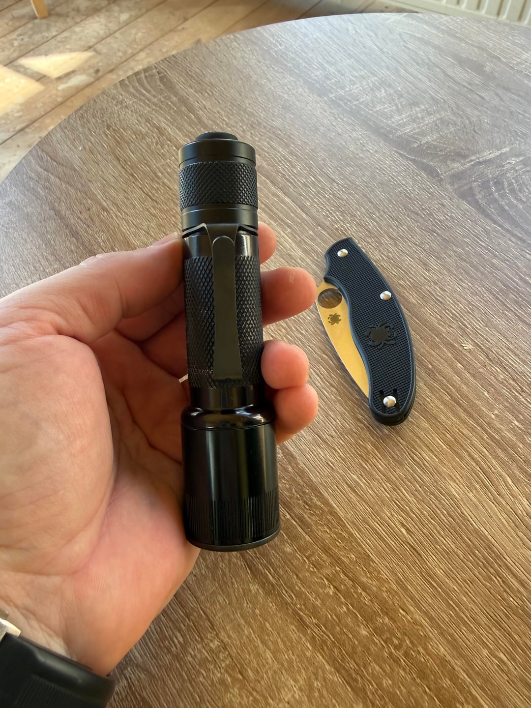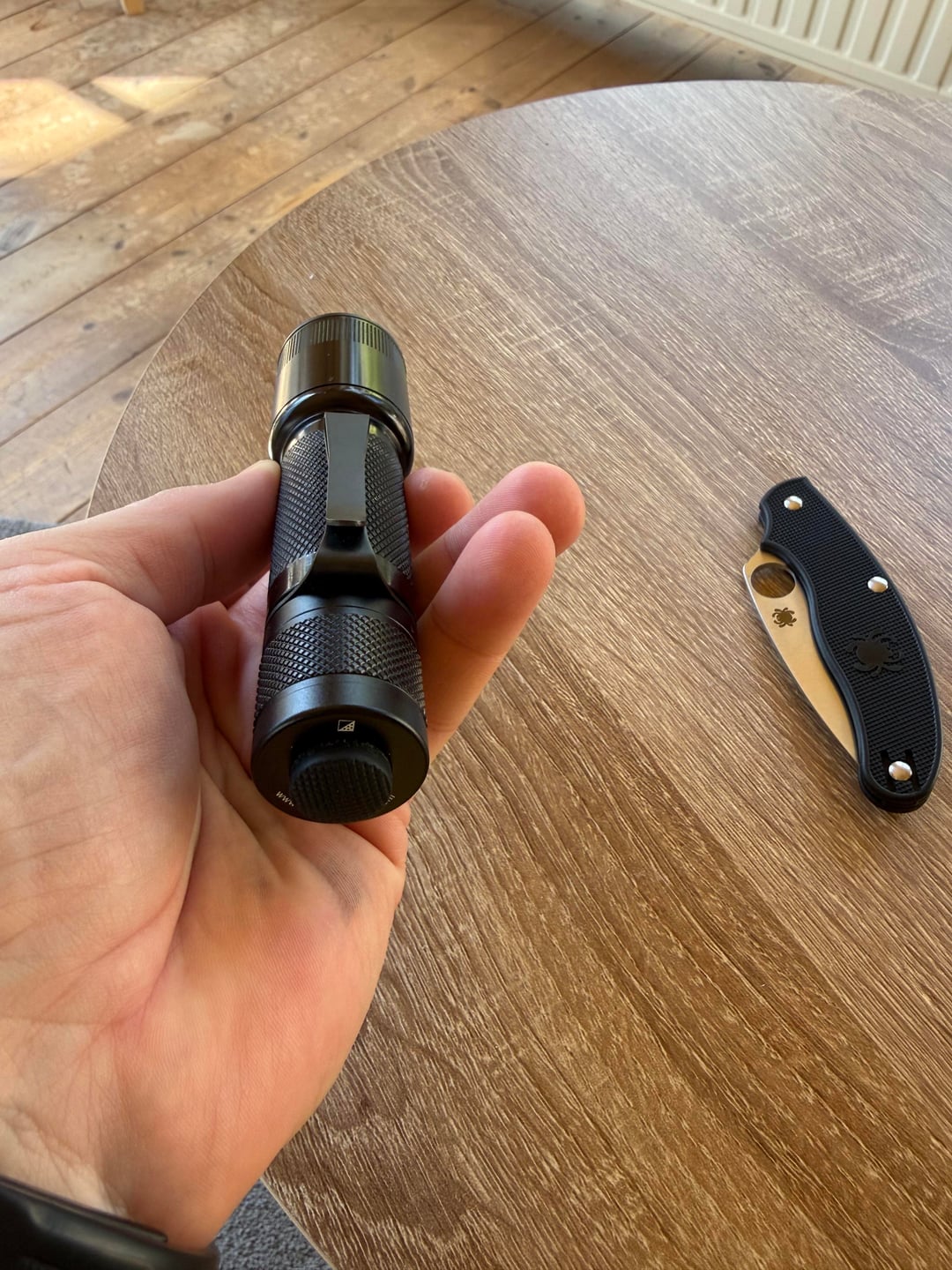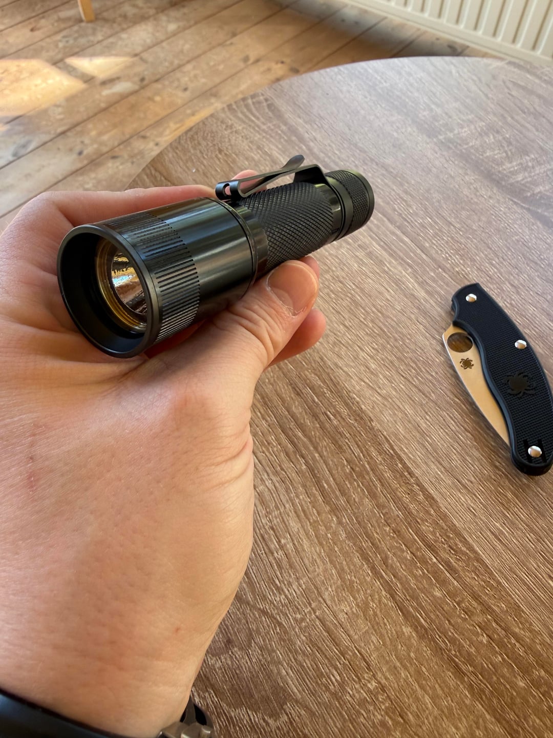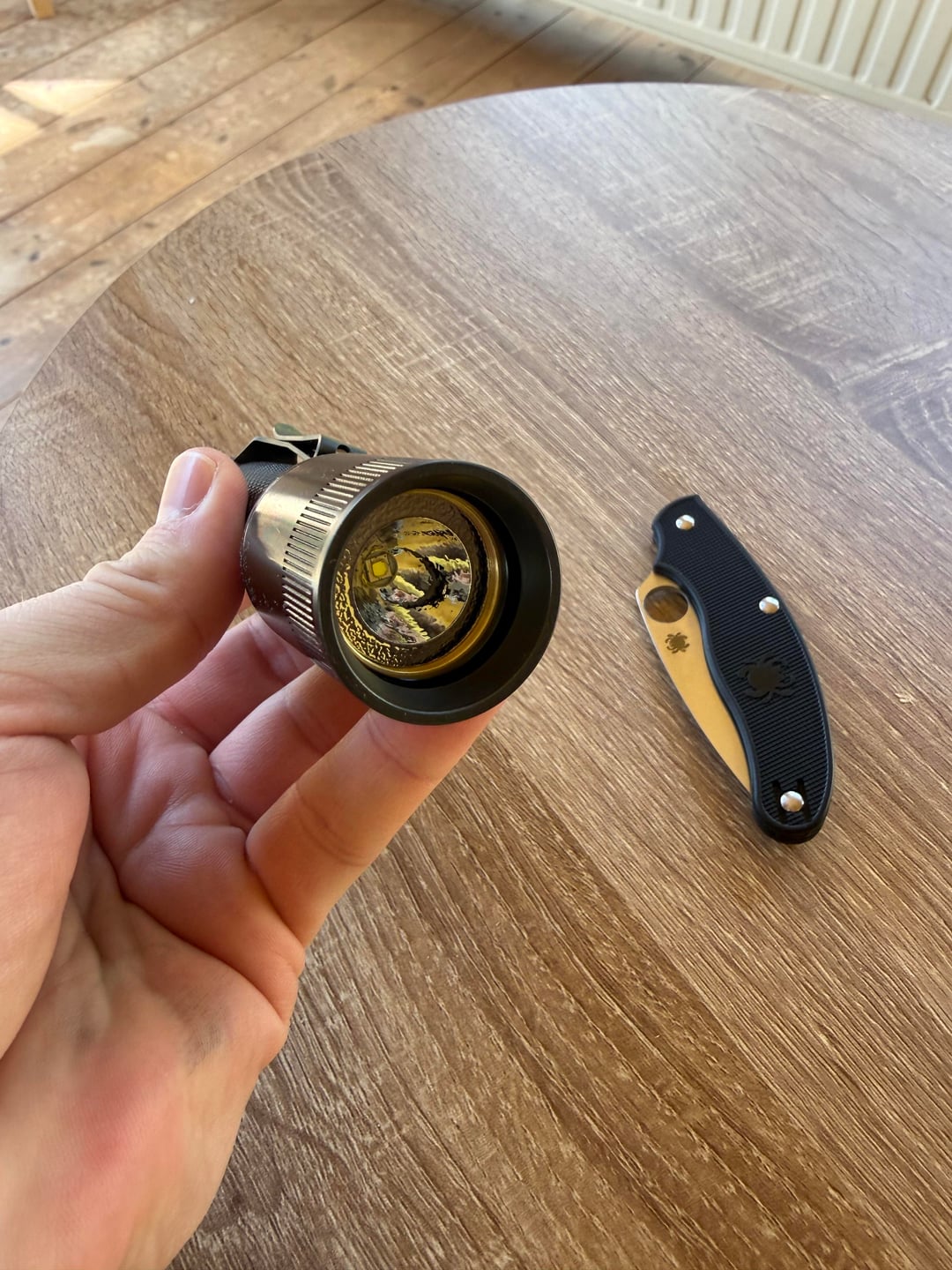 Original 90’s round head body without engraving, Malkoff M61, Lumens Factory Old Style Z44 Bezel with Optical Coated Ultra Clear UCL Tempered Glass Lens, Z41 Style McClicky Tailcap and 2 Way Clip! Akku is a Keepower protected 16650 with 2500mAh! Nice Beam Quality! Love it!