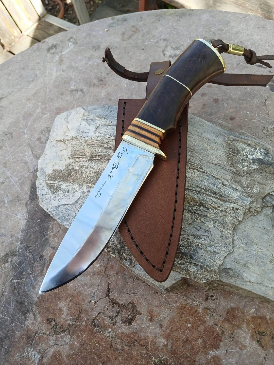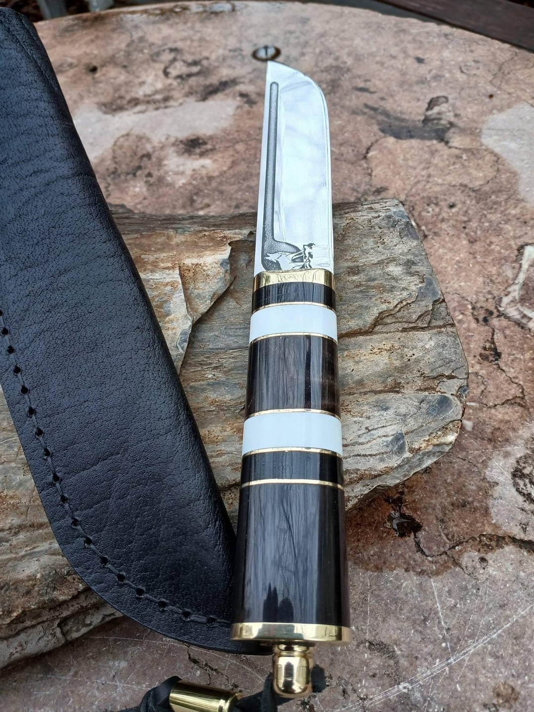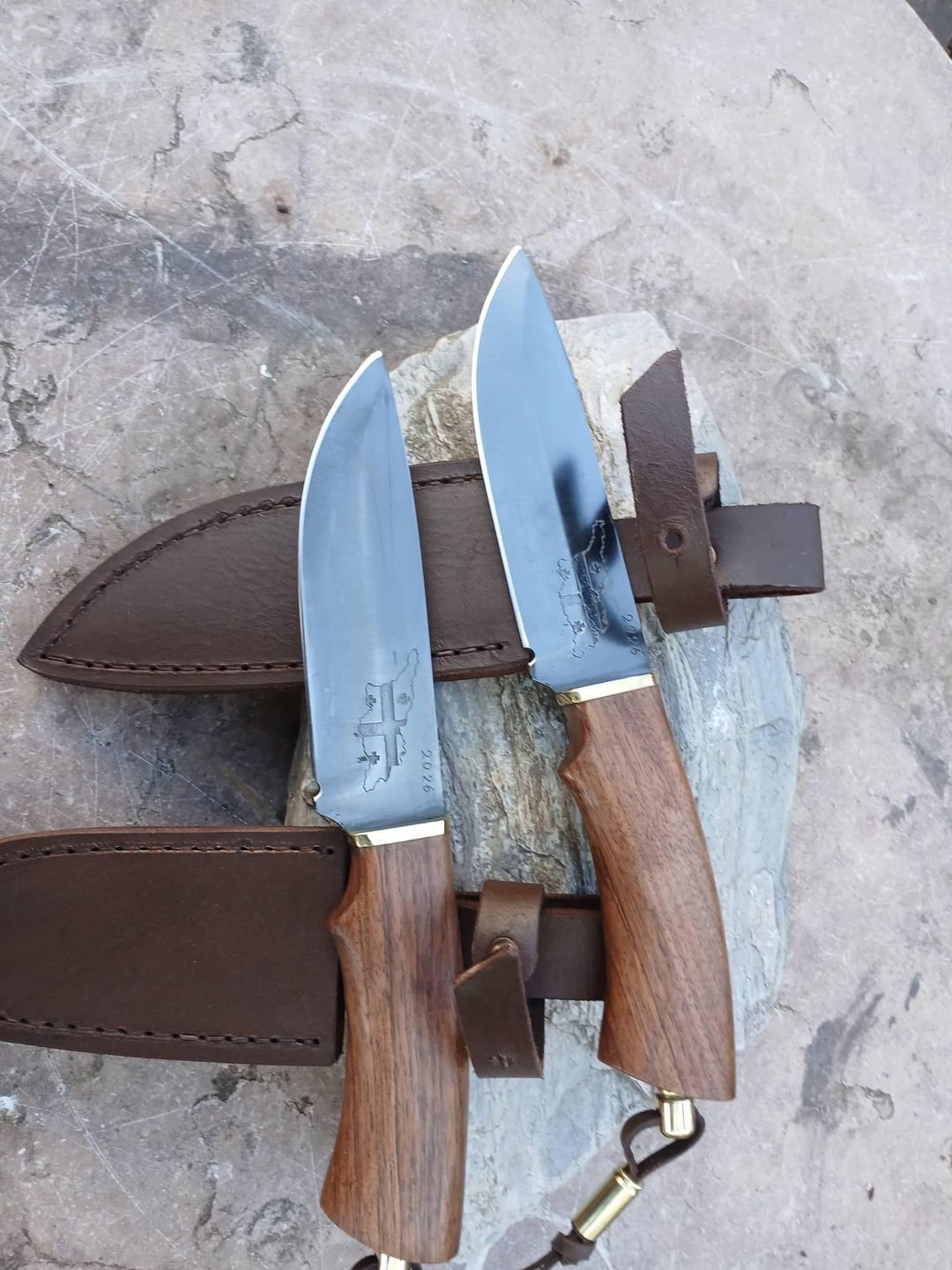 I use high-end steels (Elmax, M390, N690,), but also source local, wild materials. Handles are made of aged walnut ,bufffalo horns and etc.) Evey knife comes with a leather sheath I stitched myself.