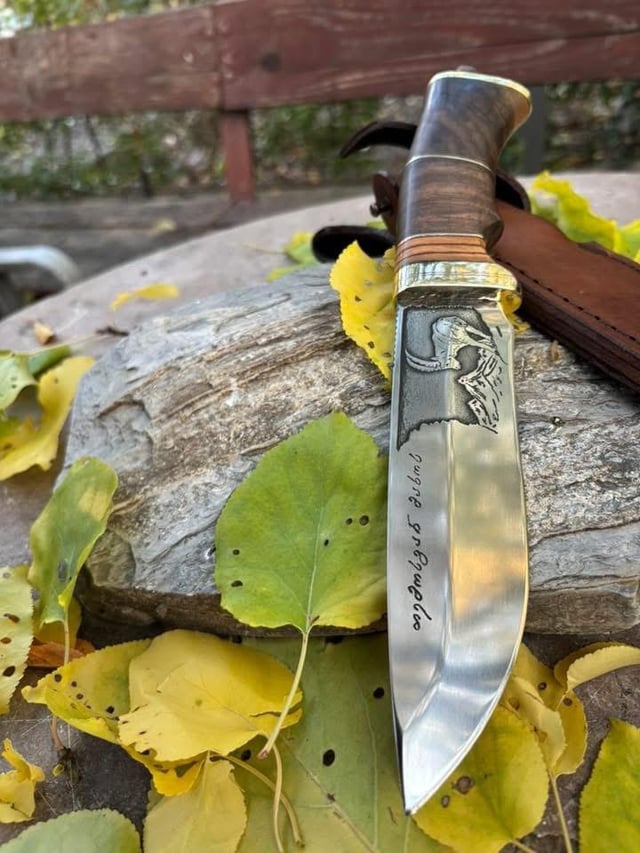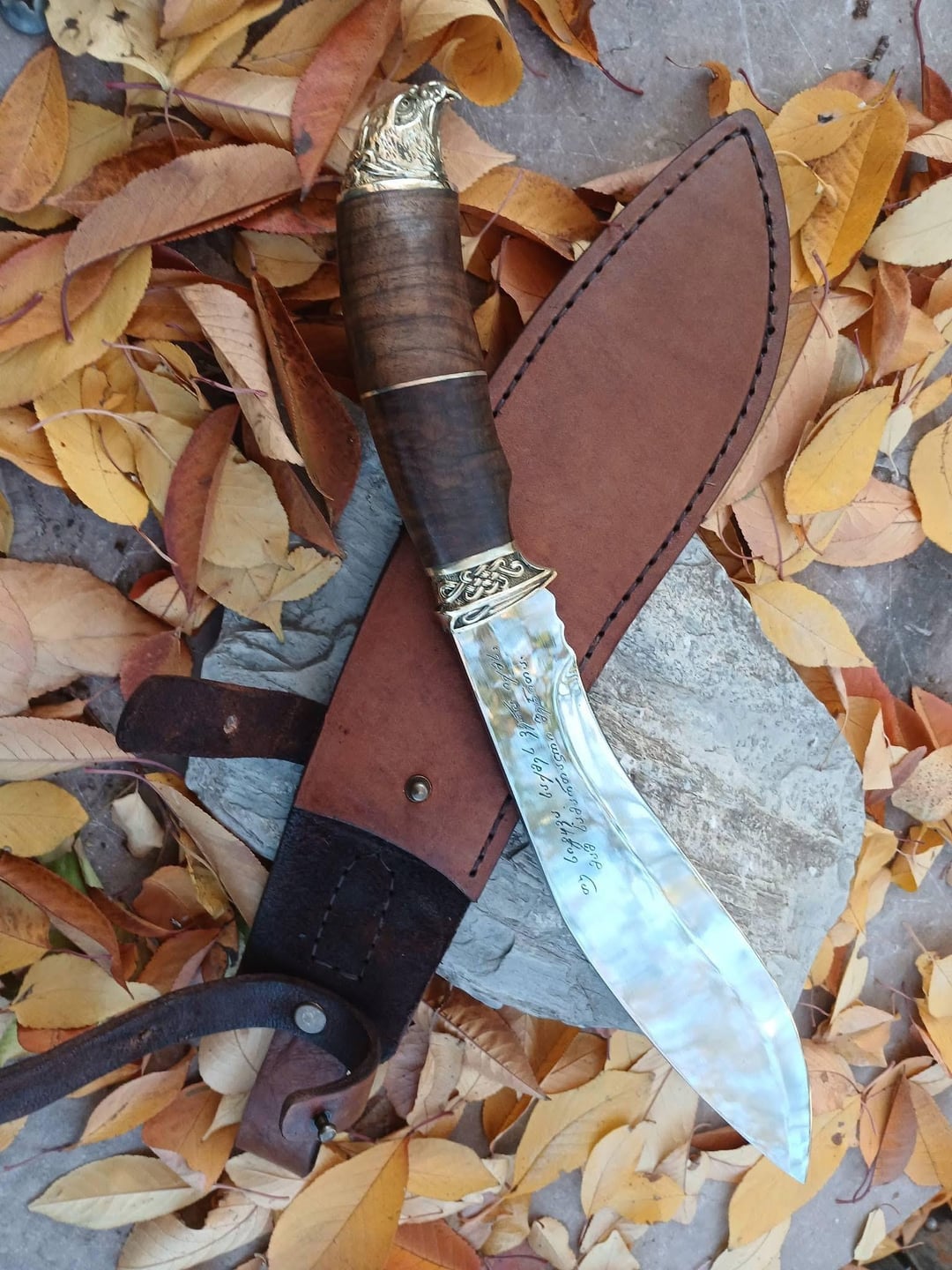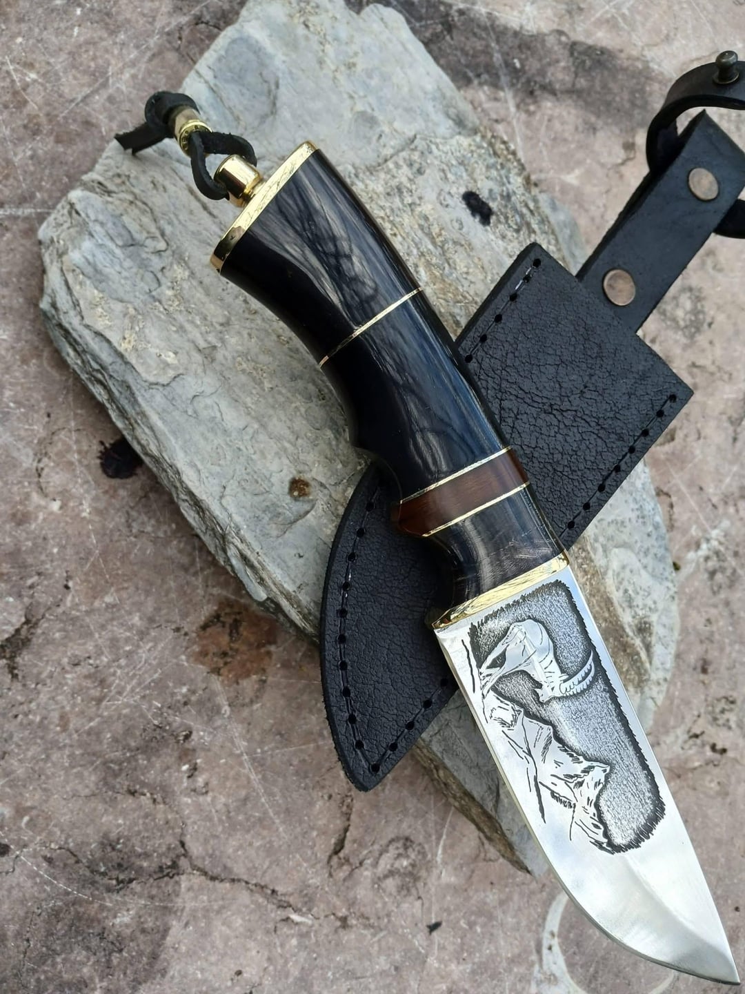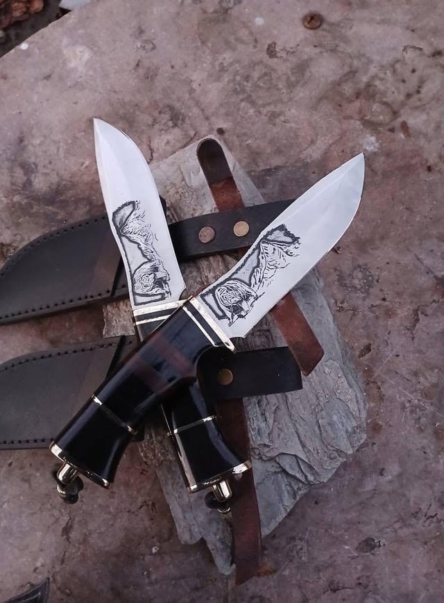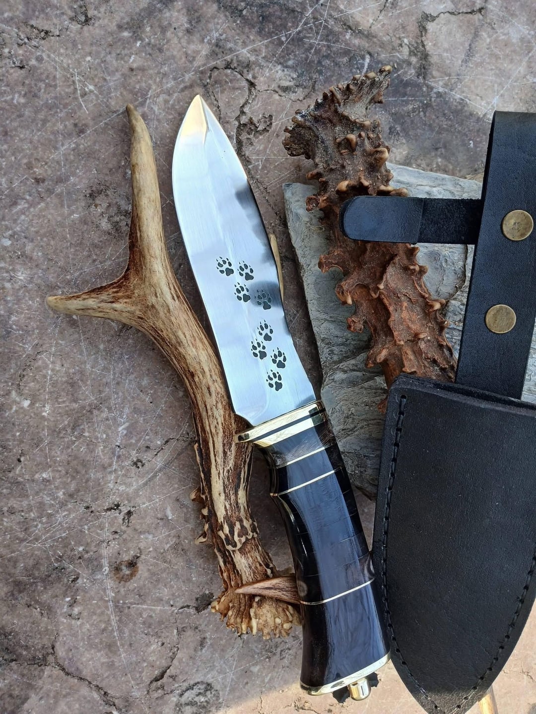 I use high-end steels (Elmax, M390, N690,), but also source local, wild materials. Handles are made of aged walnut ,bufffalo horns and etc.) Evey knife comes with a leather sheath I stitched myself.