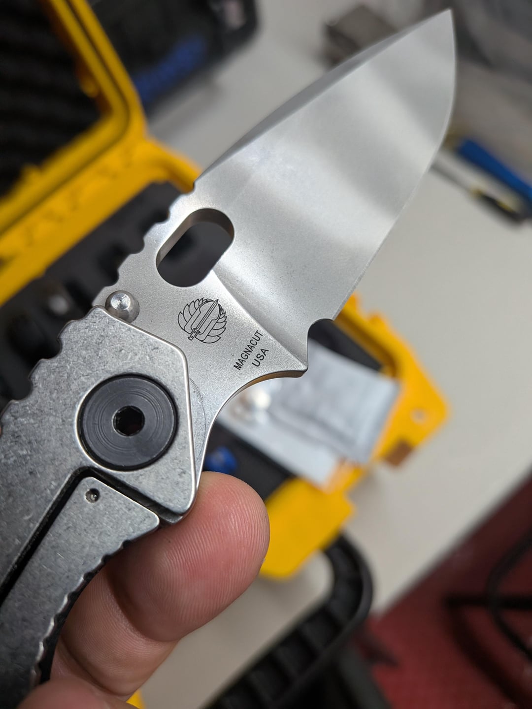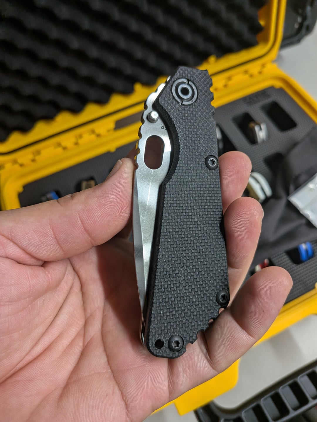 Strider SNG with Lego Black g10 , magnacut with ghost stripe finish.