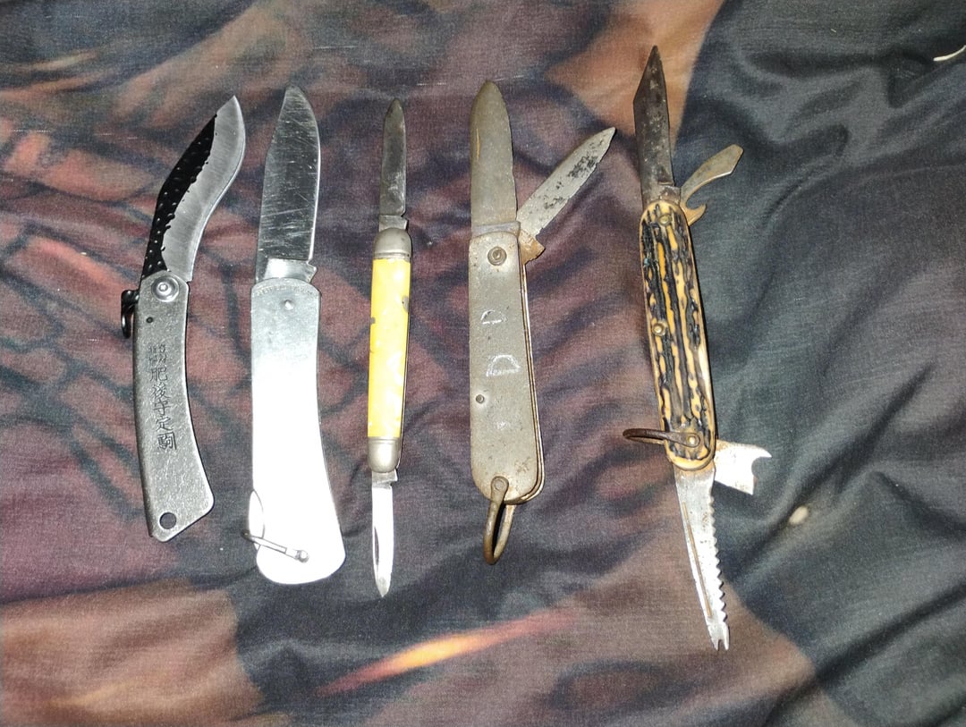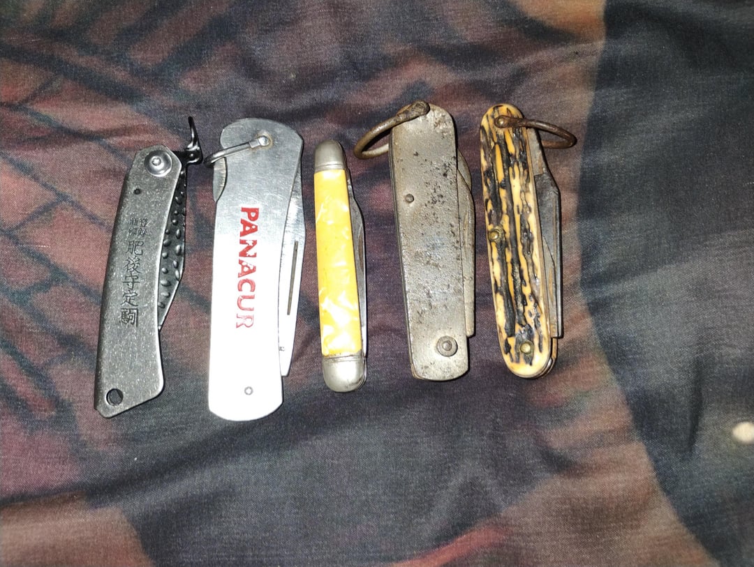 From left to right we have; A modern reproduction Higonokami knife. A stainless steel knife from Sheffield England with Panacur stamped on it. A gentleman's pocket knife from Richards, Sheffield England. An unbranded pocket knife in need of repair, and another pocket knife from Richards, Sheffield England. I have another one on the way so I may update when it arrives, however it's going to my grandparents house and a cyclone is headed out way soo…