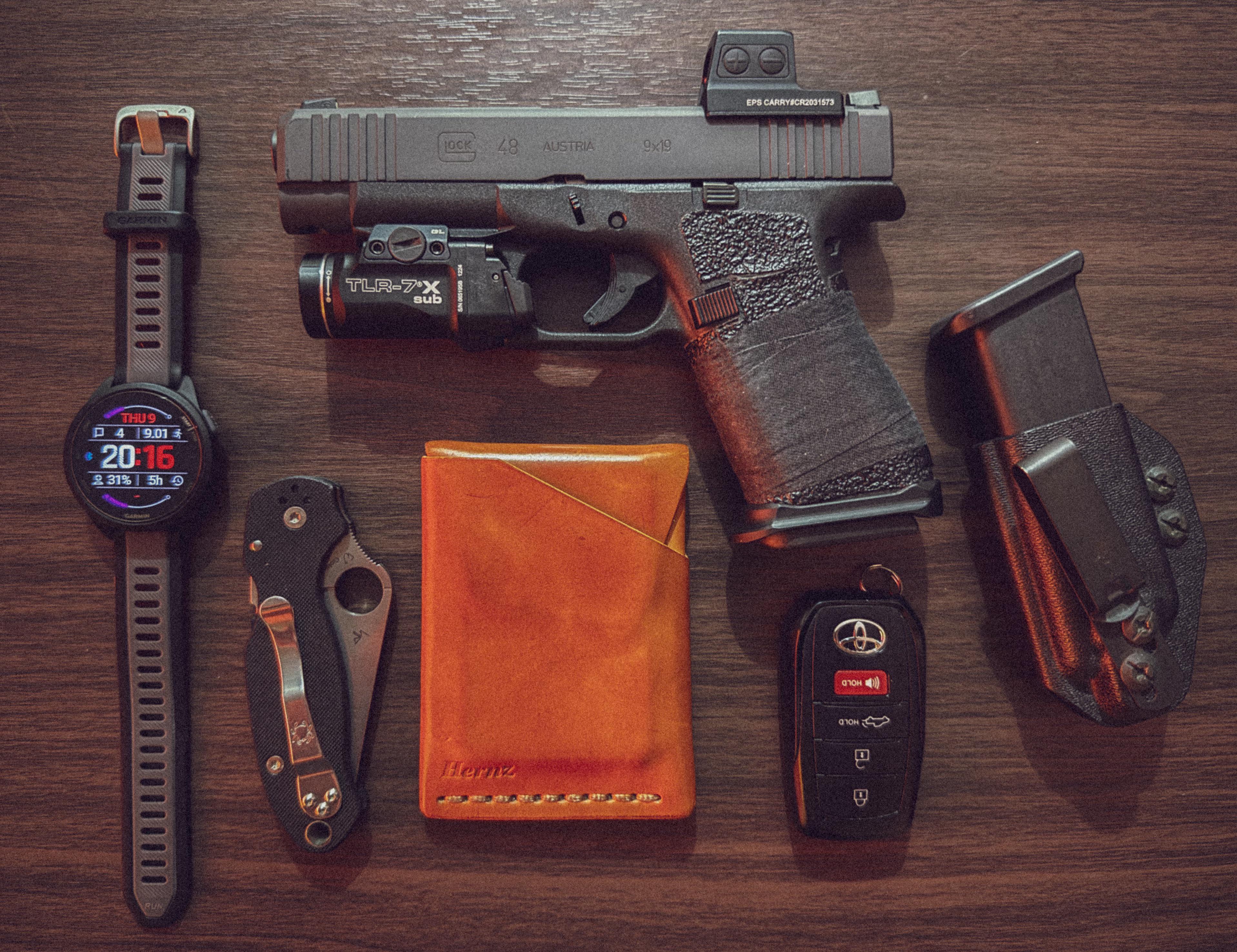 In EDC always on me April 9, 2026 garmin 165, spyderco para 3, taurus camp grain 8cm, toyota tundra keyfob, glock 48, spare mag, tenicor holsters by keikilla EDC Prev Post Thursdays Carry – Whats yours? April 9, 2026 Next Post The strange tool knife is suitable for strange people like me. April 9, 2026 Related Posts A little semi matching set with me today. April 9, 2026 Rate my “budget friendly” Work setup April 9, 2026 All I need to get around April 9, 2026 2 Comments AutoModerator 4 hours ago Thank you for posting to r/EDC! Include a detailed item list (make/model) within **1 hour** of submission. Lists can go in the title, a comment, or the image. Posts without lists will be removed. If you have already provided a list, not further action is needed, thanks | [FAQ](https://www.reddit.com/r/EDC/wiki/faq)*I am a bot, and this action was performed automatically. Please [contact the moderators of this subreddit](/message/compose/?to=/r/EDC) if you have any questions or concerns.* reddy2roc 4 hours ago No TQWrite A CommentYou must be logged in to post a comment.