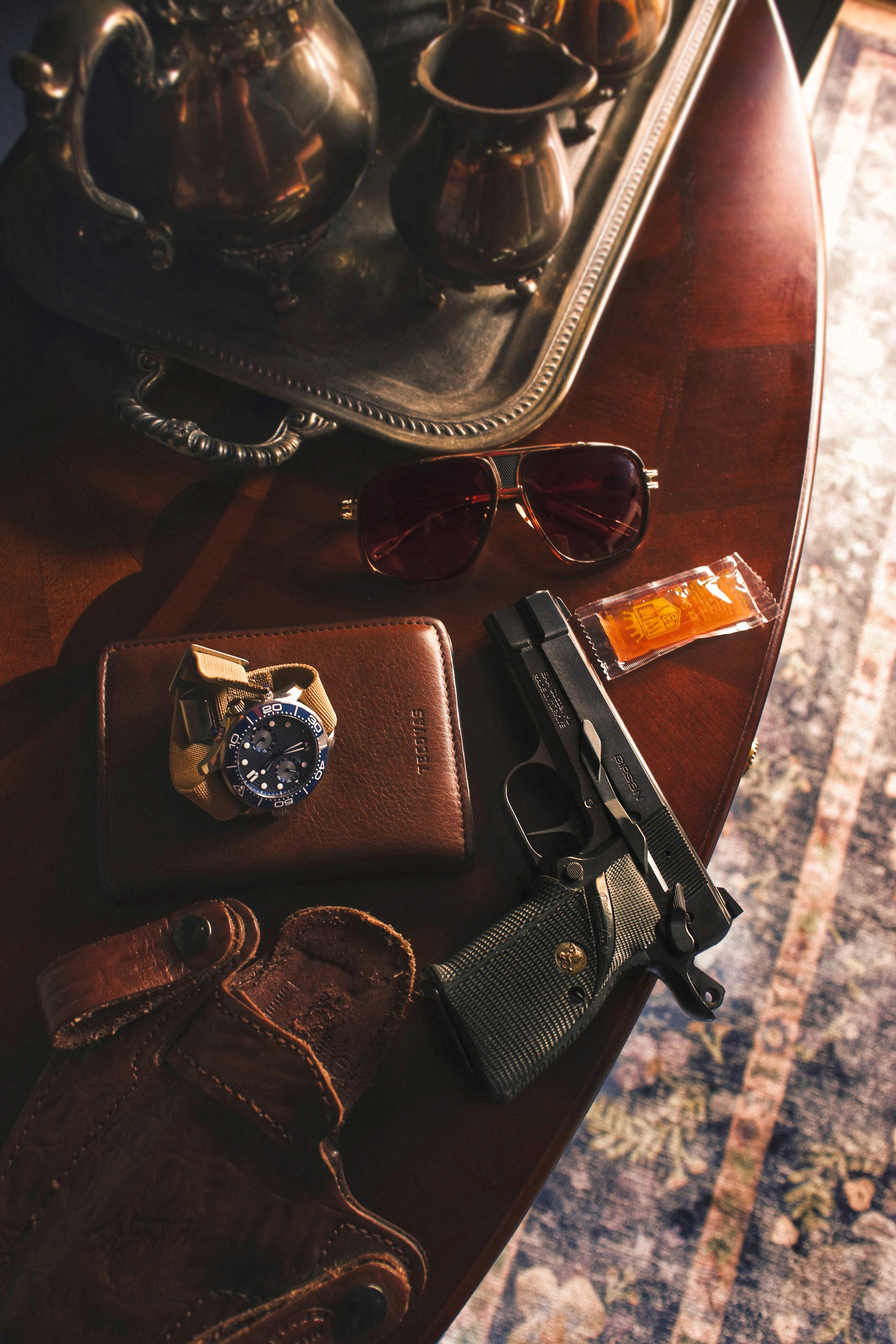 1. Omega Seamaster Chrono on parachute strap 2. Girsan MC PI Match 3. Tecovas Passport wallet 4. Xtreme Carry leather holster 5. Duck Sauce 6. Amazon shades (from Bullet Train)