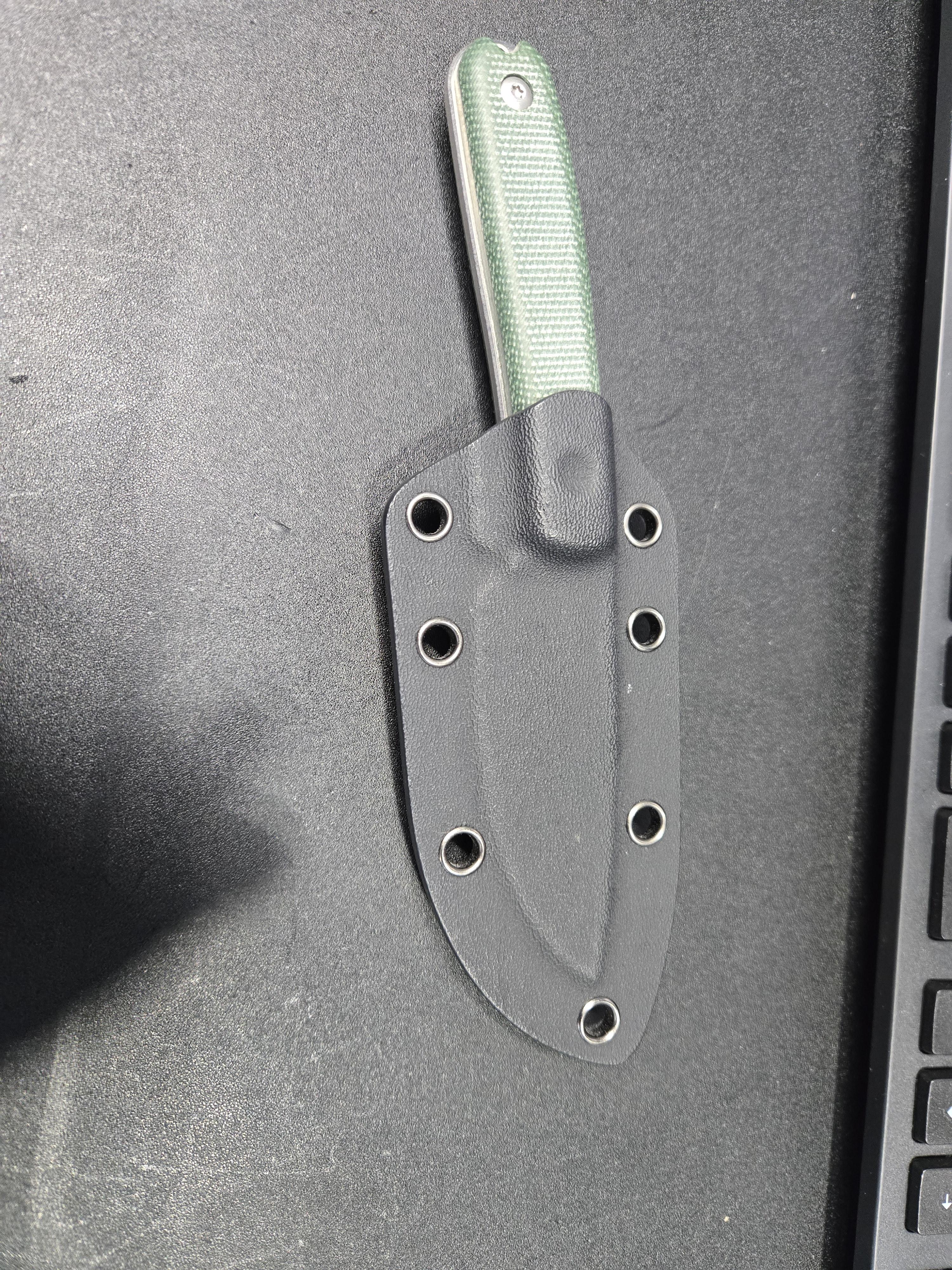 Or drill a small hole close to the top, but not too close, near where the handle sits inside the kydex, closer than the existing rivets. Add a small screw with a nut on the other side. This should tighten the sheath. If you use a locknut, you should be able to back it off a hair if you end up too tight.