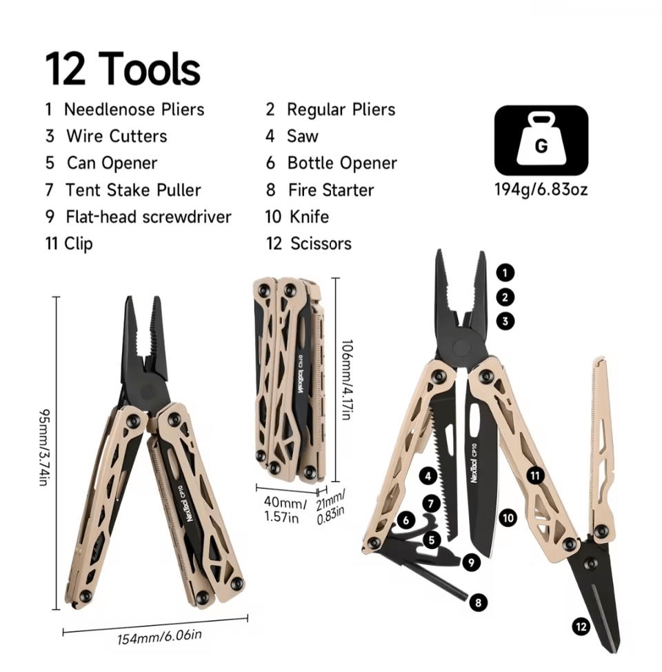 Pretty interesting toolset (that tent stake puller looks unique, and they used the serrated scissors) and reasonable features (liner locks for the saw and knife and a fire starter, but non-replaceable wire cutter blades), just not sure about the choice of steel for the knife.