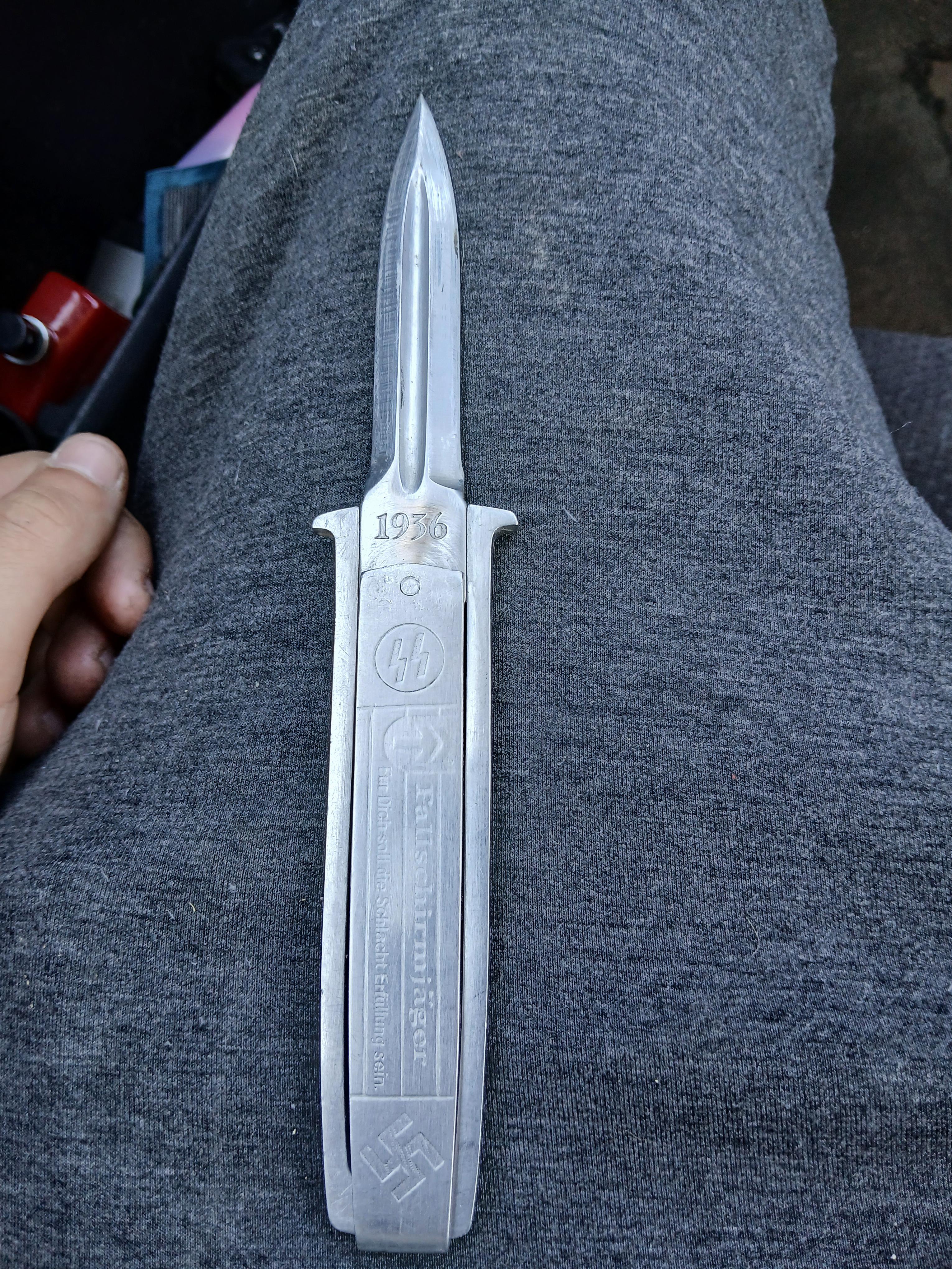 Definitely a reproduction, originals would have at least some level of patina, with more defined stamp work on the handle. You can buy new repros of these for $40-ish. Looks to me like they made the body of the knife with aluminum based on the extensive damage, steel doesn’t wear like that