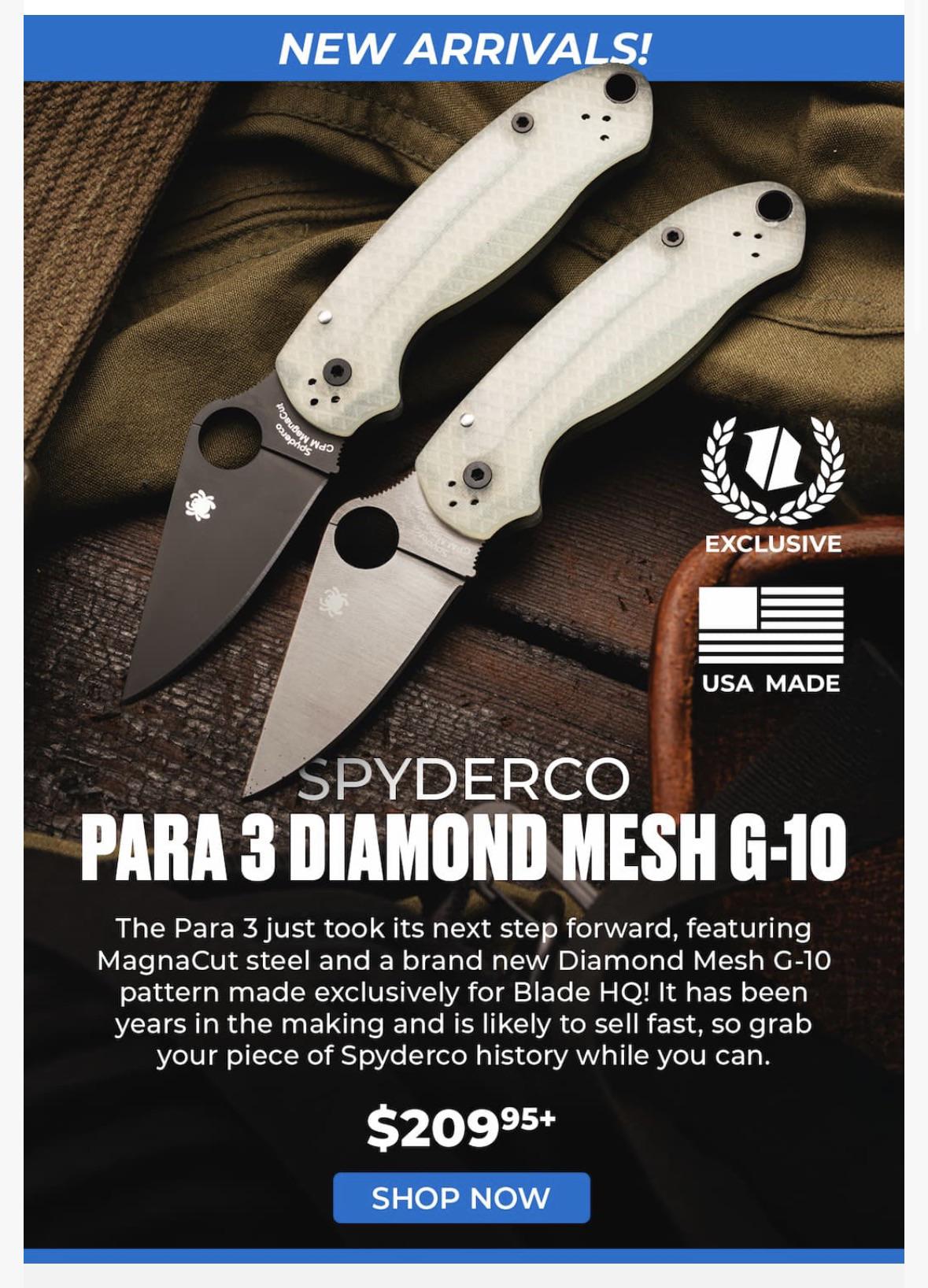 It also seems that BladeHQ sent these new exclusive PM2’s and Para 3’s to every knife YouTuber, so that the knife-o-sphere is saturated with people gushing over the combination of Magnacut and jade G10 on a hyper-popular model—despite the fact that all these things already exist.