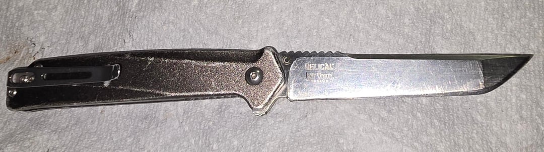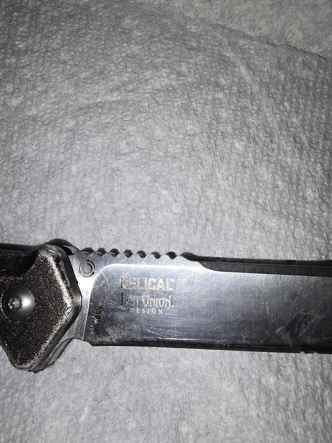 In KNIVES Anyone know anything about this knife? April 12, 2026 found it in my late uncle's things and I dont recognize the maker's marking on it. any help is much appreciated, thanks!by Faith_Over_Fear_91 KnifeKnives Prev Post SOTC KIZER April 12, 2026 Next Post Spotted at a local pawn shop is this fake? April 12, 2026 Related Posts 3 recent creations, including my first use of damasteel. April 16, 2026 Been really enjoying this guy! April 16, 2026 I want more. April 16, 2026 4 Comments d9jms 4 days ago Do you know you can search google by going to [images.google.com](http://images.google.com) and tossing an image and it’ll figure it out for you?I did that with your image and found this: [https://www.knifecenter.com/item/CRK500GXP/columbia-river-k500gxp-ken-onion-helical-flipper-knife-satin-plain-blade-black-aluminum-handles](https://www.knifecenter.com/item/CRK500GXP/columbia-river-k500gxp-ken-onion-helical-flipper-knife-satin-plain-blade-black-aluminum-handles) coast_elk 4 days ago Crkt Helical?https://www.crkt.com/knife/helical-folding-knife-with-liner-lock?srsltid=AfmBOoryY9SuquXsoShHz2LhSqAh5Qsi4FvrccP0QCZsMNnDZdyPvMJi laundro_mat 4 days ago Ken Onion is a well-known and respected knife designer. That’s a pretty nice find! ZDMaestro0586 4 days ago Looks like my CRKT Facet, onions are slick.Write A CommentYou must be logged in to post a comment.