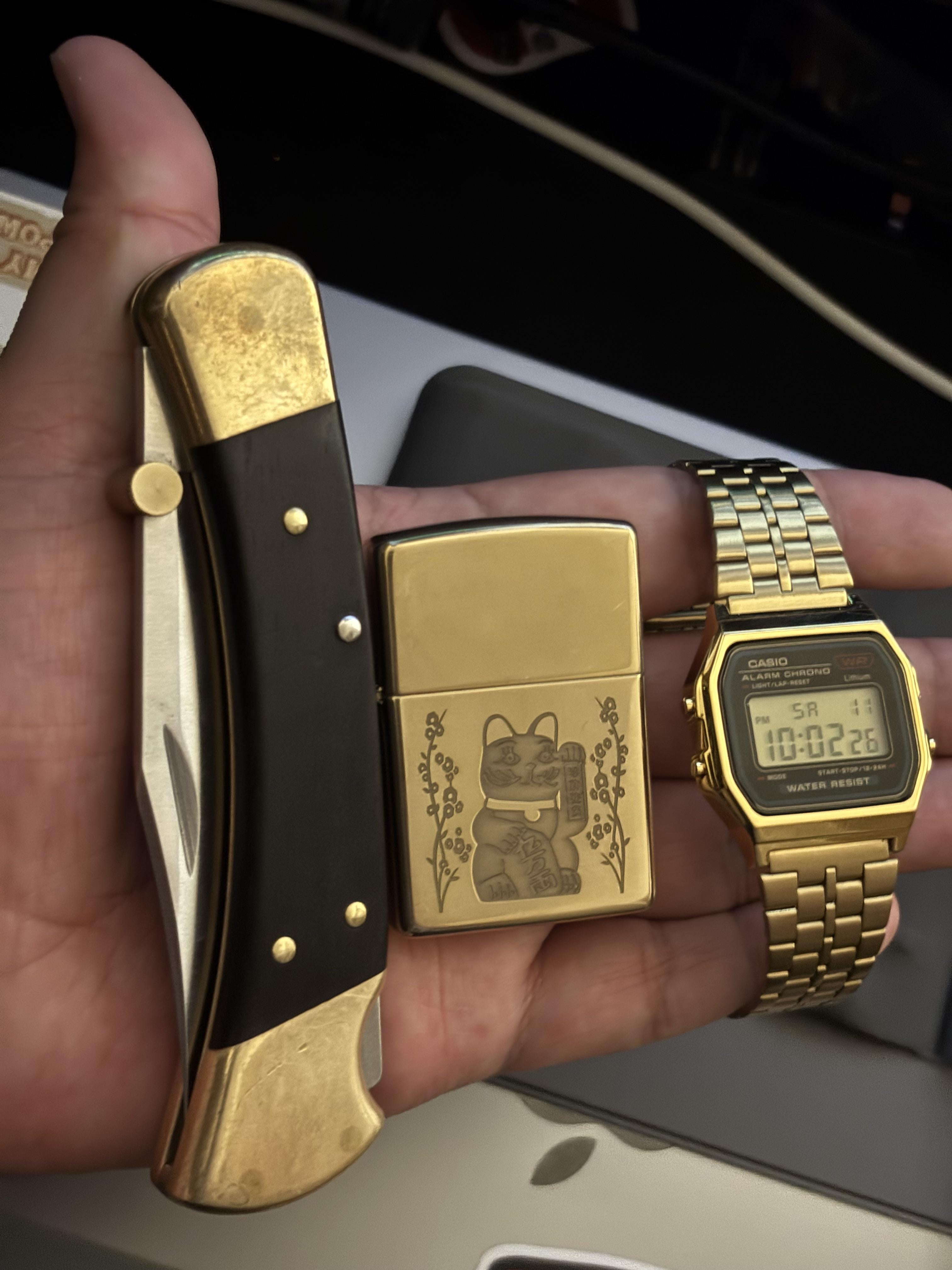 In EDC Digging brass and gold lately April 12, 2026 Buck 110 with Kwik brass thumb studBrass Zippo, engraved lucky catCasio A159WGEA-1 with Ollee watch module by hijodetumadr3 EDC Prev Post Crusaders April 12, 2026 Next Post Saturday Night Carry April 12, 2026 Related Posts My fabrication EDC marking tools April 12, 2026 Mercury Hunting Lockback stag Knife April 12, 2026 Saturday Night Carry April 12, 2026 1 Comment AutoModerator 3 hours ago Thank you for posting to r/EDC! Include a detailed item list (make/model) within **1 hour** of submission. Lists can go in the title, a comment, or the image. Posts without lists will be removed. If you have already provided a list, not further action is needed, thanks | [FAQ](https://www.reddit.com/r/EDC/wiki/faq)*I am a bot, and this action was performed automatically. Please [contact the moderators of this subreddit](/message/compose/?to=/r/EDC) if you have any questions or concerns.*Write A CommentYou must be logged in to post a comment.