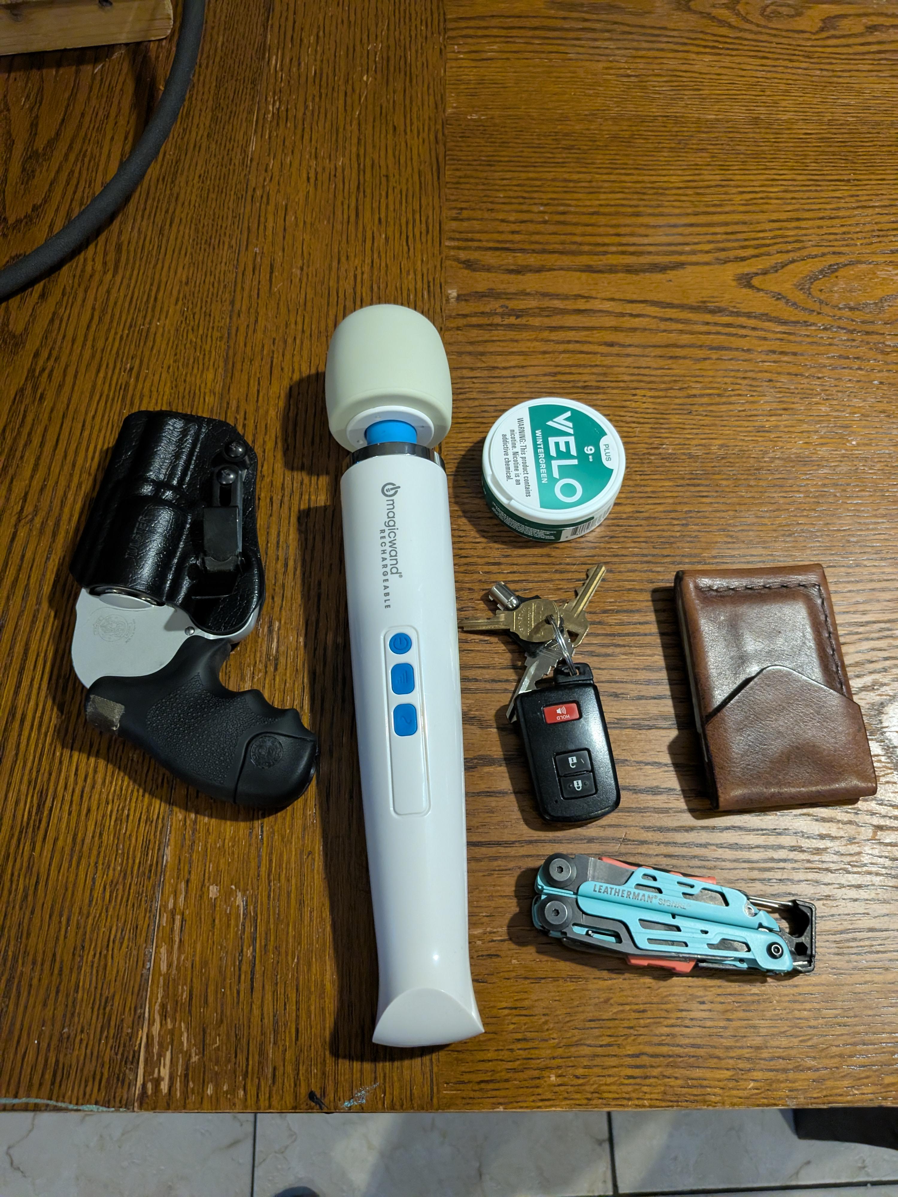 In EDC Saturday Night Carry April 12, 2026 S&W Model 438Hitachi Magic Wand(Rechargeable)Nicotine PouchesKeysLeatherman SignalOldis Road One Walletby pocketsand1775 EDC Prev Post Digging brass and gold lately April 12, 2026 Next Post Brothers from another mother April 12, 2026 Related Posts Mercury Hunting Lockback stag Knife April 12, 2026 Digging brass and gold lately April 12, 2026 Weekend carry April 12, 2026 1 Comment AutoModerator 2 hours ago Thank you for posting to r/EDC! Include a detailed item list (make/model) within **1 hour** of submission. Lists can go in the title, a comment, or the image. Posts without lists will be removed. If you have already provided a list, not further action is needed, thanks | [FAQ](https://www.reddit.com/r/EDC/wiki/faq)*I am a bot, and this action was performed automatically. Please [contact the moderators of this subreddit](/message/compose/?to=/r/EDC) if you have any questions or concerns.*Write A CommentYou must be logged in to post a comment.