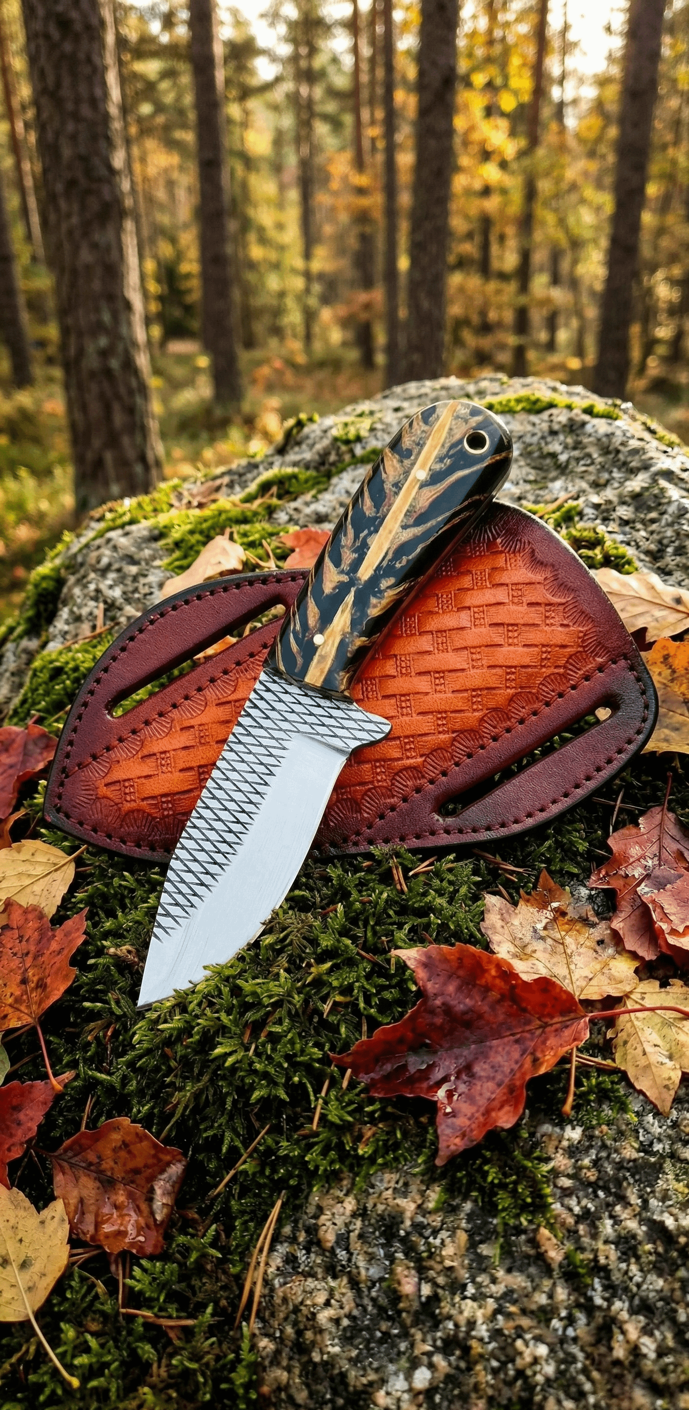 This one has a hand-tooled leather sheath my guy stitched by hand too. No machines involved in the process.