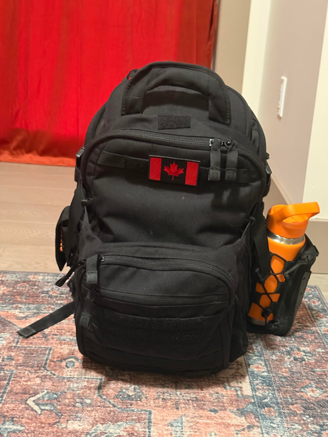 Exterior: Water bottle pouch (YETI) w/ small pocket (Leatherman ratchet + bits), Leatherman Wave+ (custom), Jetbeam Kunai E26
