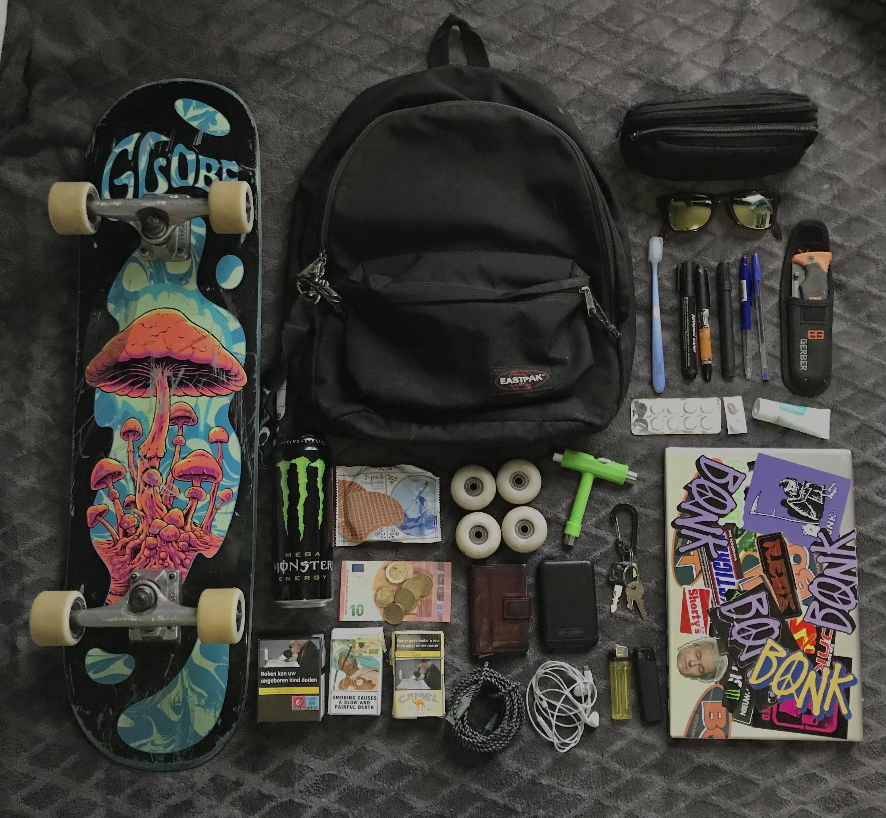 – skateboard(always between my bag and my back)