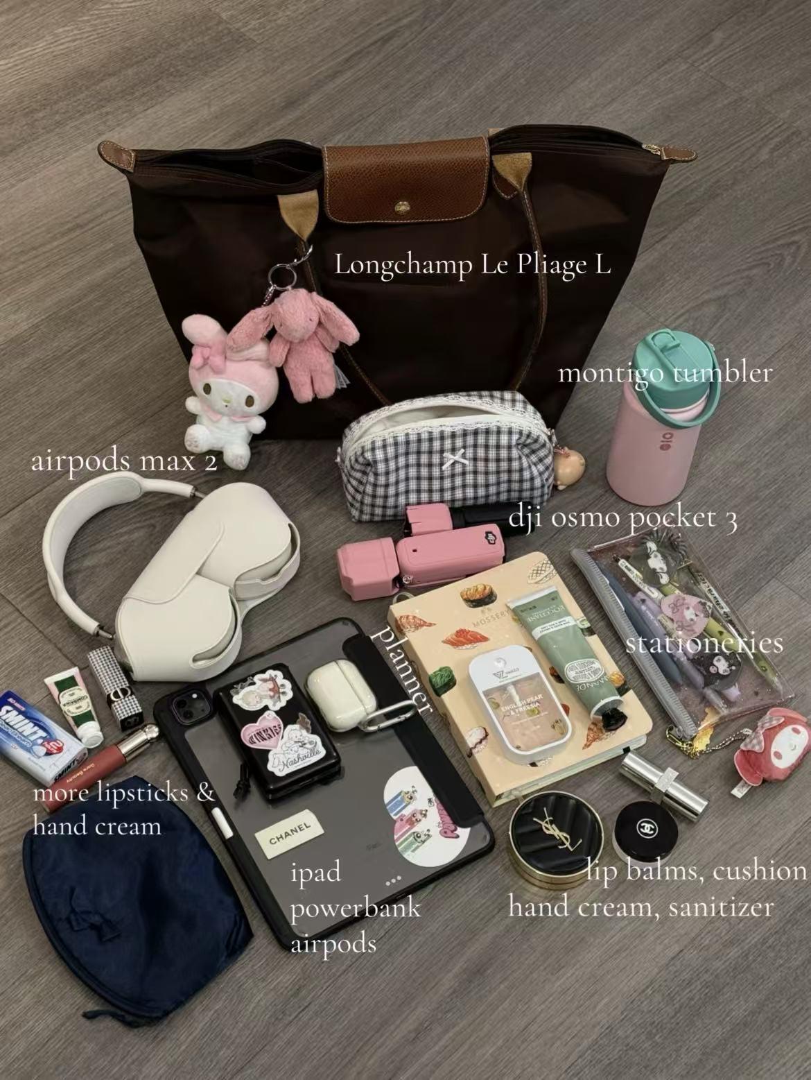 contents: ipad (for notes), airpods max & airpods pro, dji osmo pocket 3 (for vlogging), mossery planner, montigo tumbler, kuromi clear stationery pouch (found this on shein, so cute!), l'occitane hand cream (almond), ysl cushion, chanel lip balm, dior lipstick, hand sanitizer, mints, powerbank, my melody & bunny keychains (obsessed with sanrio lol)