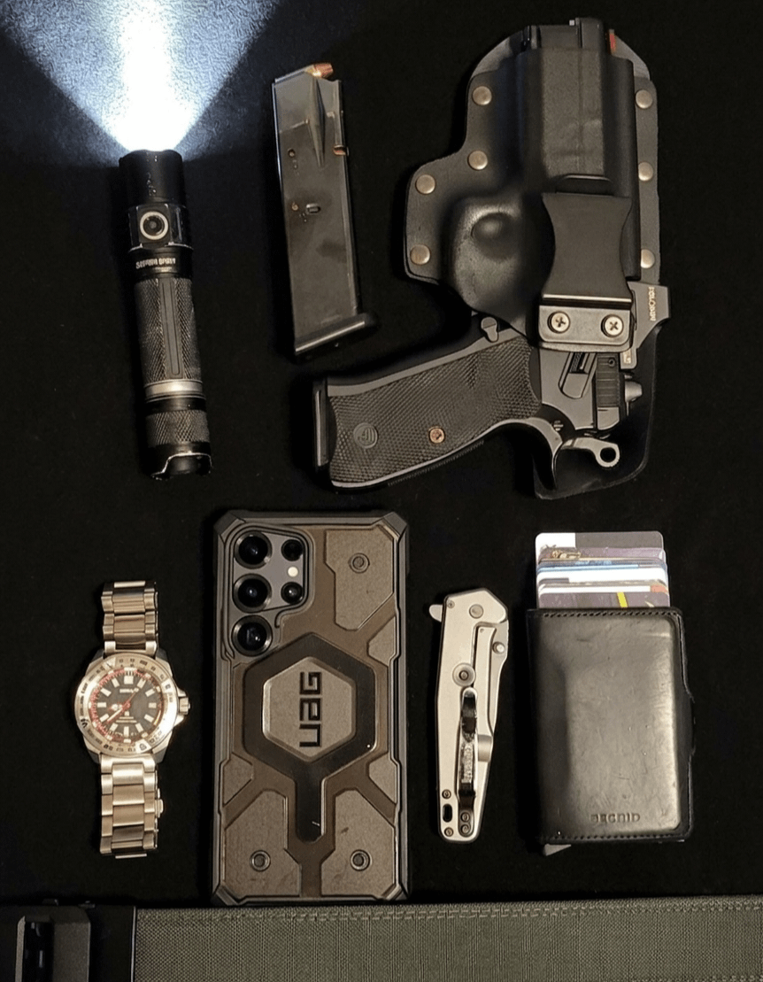EDC gun is a CZ 75 SP01 with a full leather AIWB holster