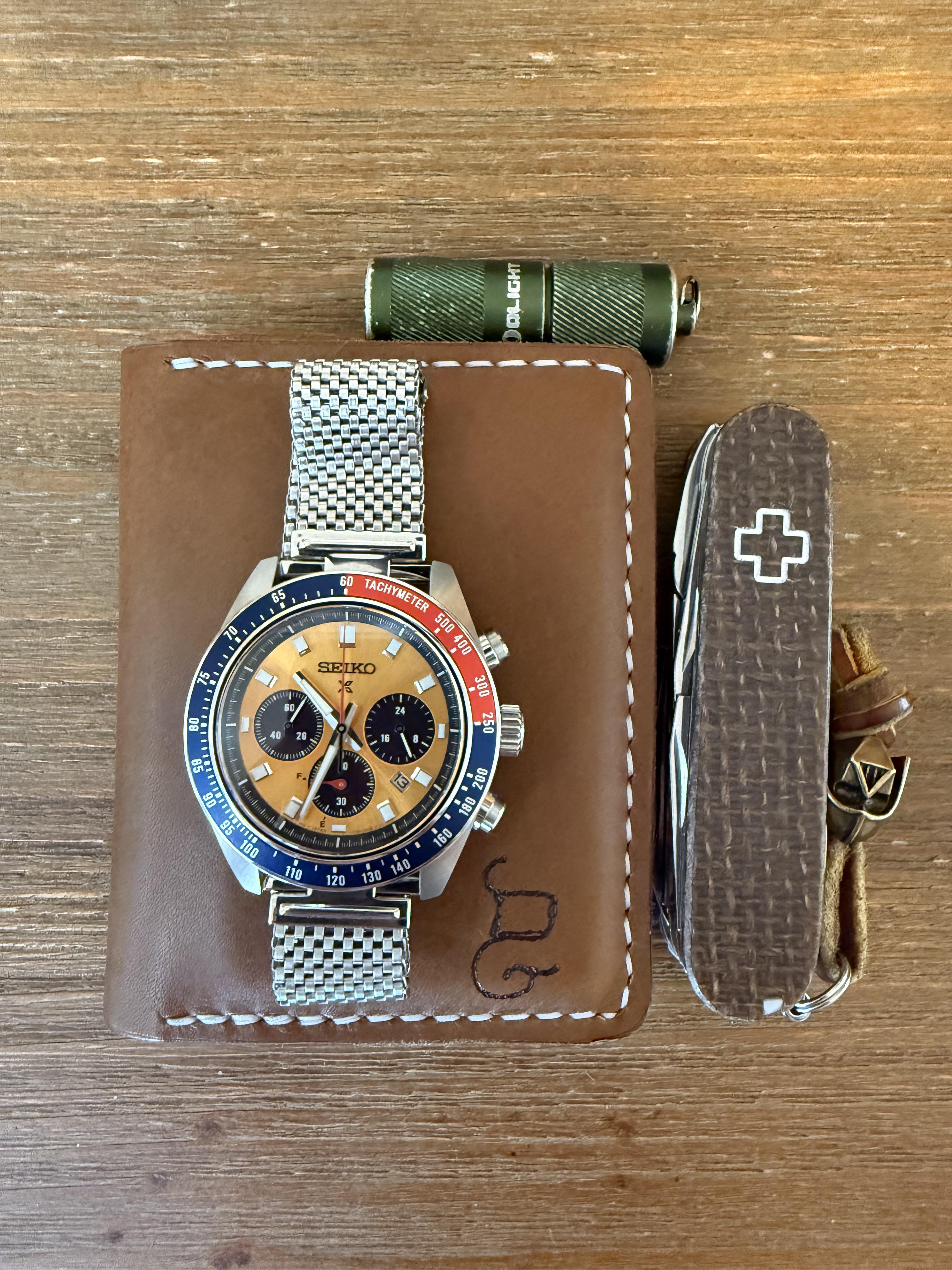 Wallet that I made by hand, Seiko Chronograph on a Forstner Komfit band, Olight I normally keep on my keys, and a Victorinox Deluxe Tinker with after market plus scales. Hope everyone is having a good day!