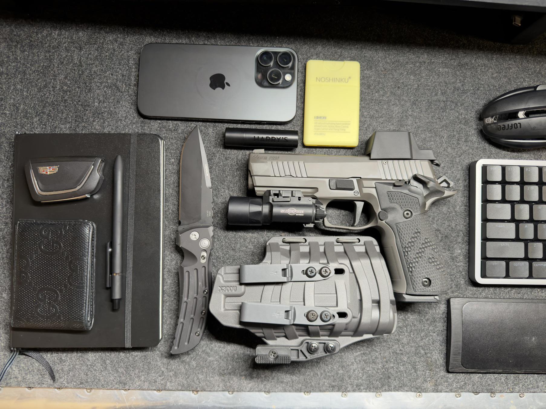 HOGUE EX-A01 • SIG SAUER P226 X SERIES LEGION • PHLSTER FLOODLIGHT 20 • KEY FOB • PEN • WALLET • NOTEBOOK • IPHONE