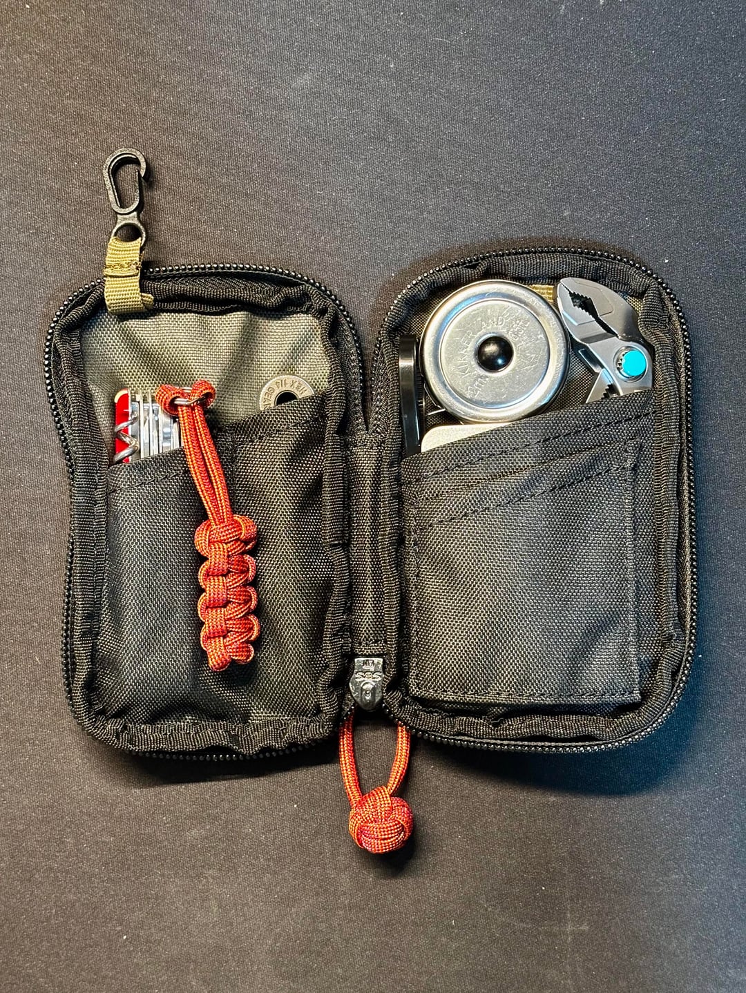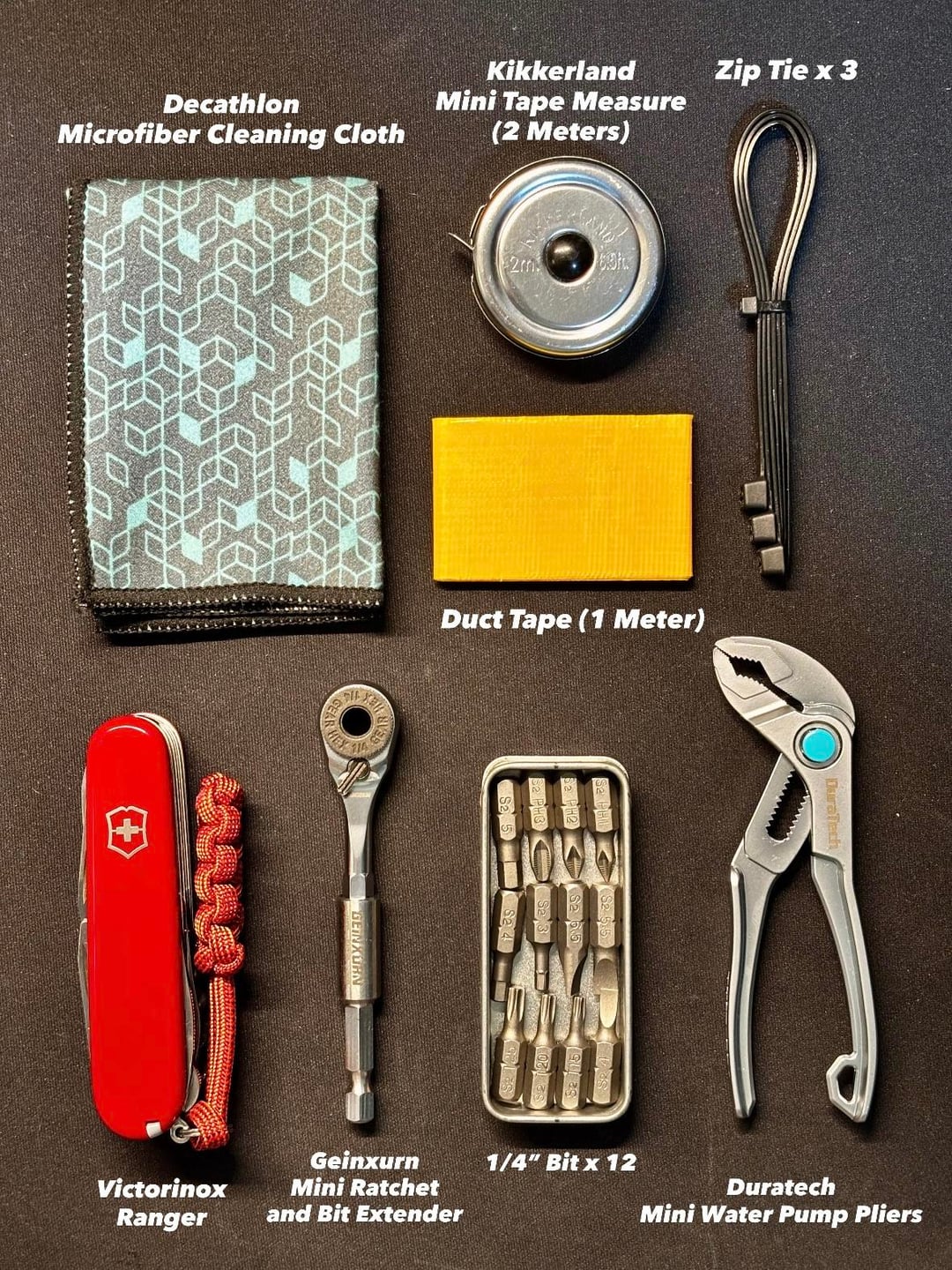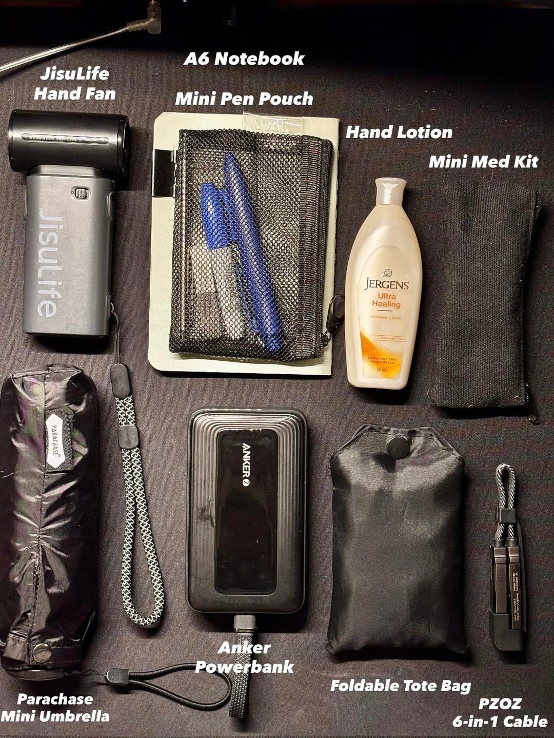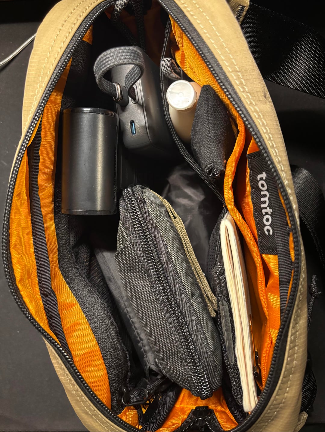 Bare essentials stay in my pockets, a dedicated fix-it pouch handles repairs, and the TomToc T33 covers the longer days when I need tech, hygiene stuff, and weather gear.