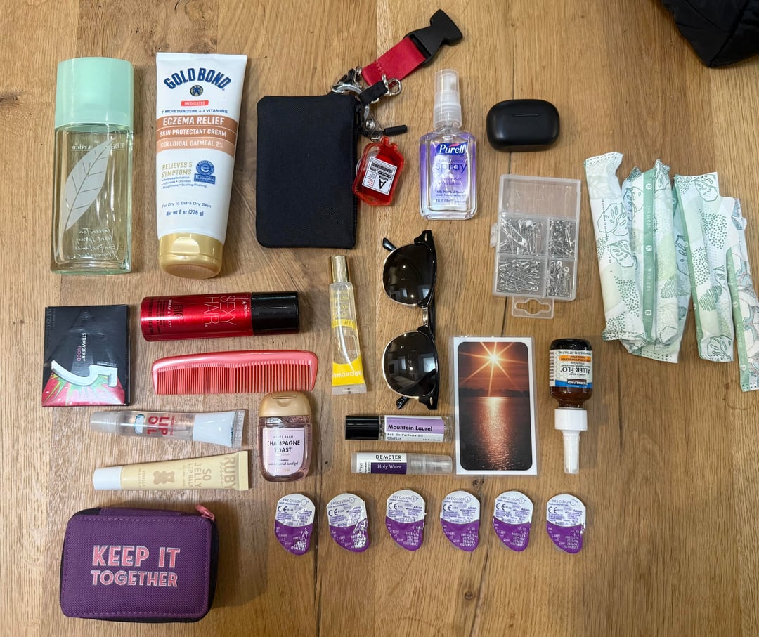 I’d love to see your guesses about me. From top left to bottom right: Elizabeth Arden green tea perfume, hand lotion, work badge and badge holder, hand sanitizer, Bluetooth earbuds I once left in the washer, safety pins, tampons, strawberry flavored 5 gum, sexy hair hairspray, comb, lipgloss, sunglasses, obituary card, allergen nasal spray, more lipgloss, more hand sanitizer, Demeter fragrance Mountain Laurel & Holy Water, medication holder, and apparently expired contacts. Bag is from Vera Bradley. Love it but wouldn’t have gotten myself, my mom said I couldn’t show up to work with just a falling apart tote bag 😂