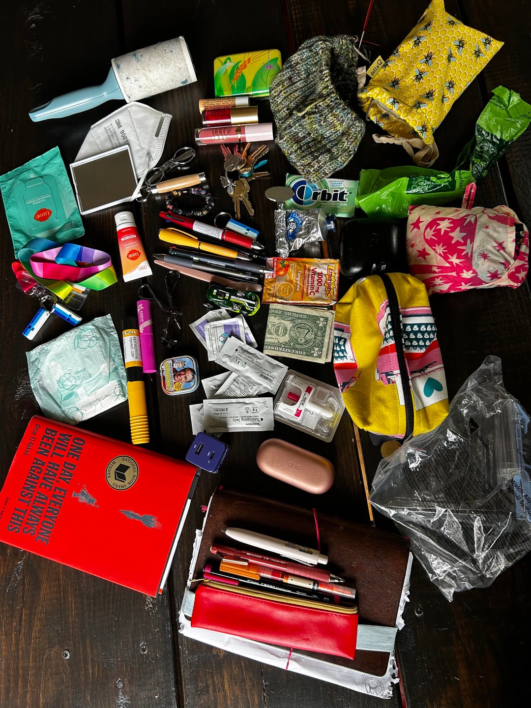 Small bag to hold everything to the left of it: narcan, quip floss, charger block, lubricating jelly, mints, mascara,eyelash curler, epi pen, pad, name lanyard, lume deodorant, pens, pretty darning needle holder, hair tie, scissors, keys, whistle, gum, lotion, emergen-c, cash, matchbox car, rubbing alcohol