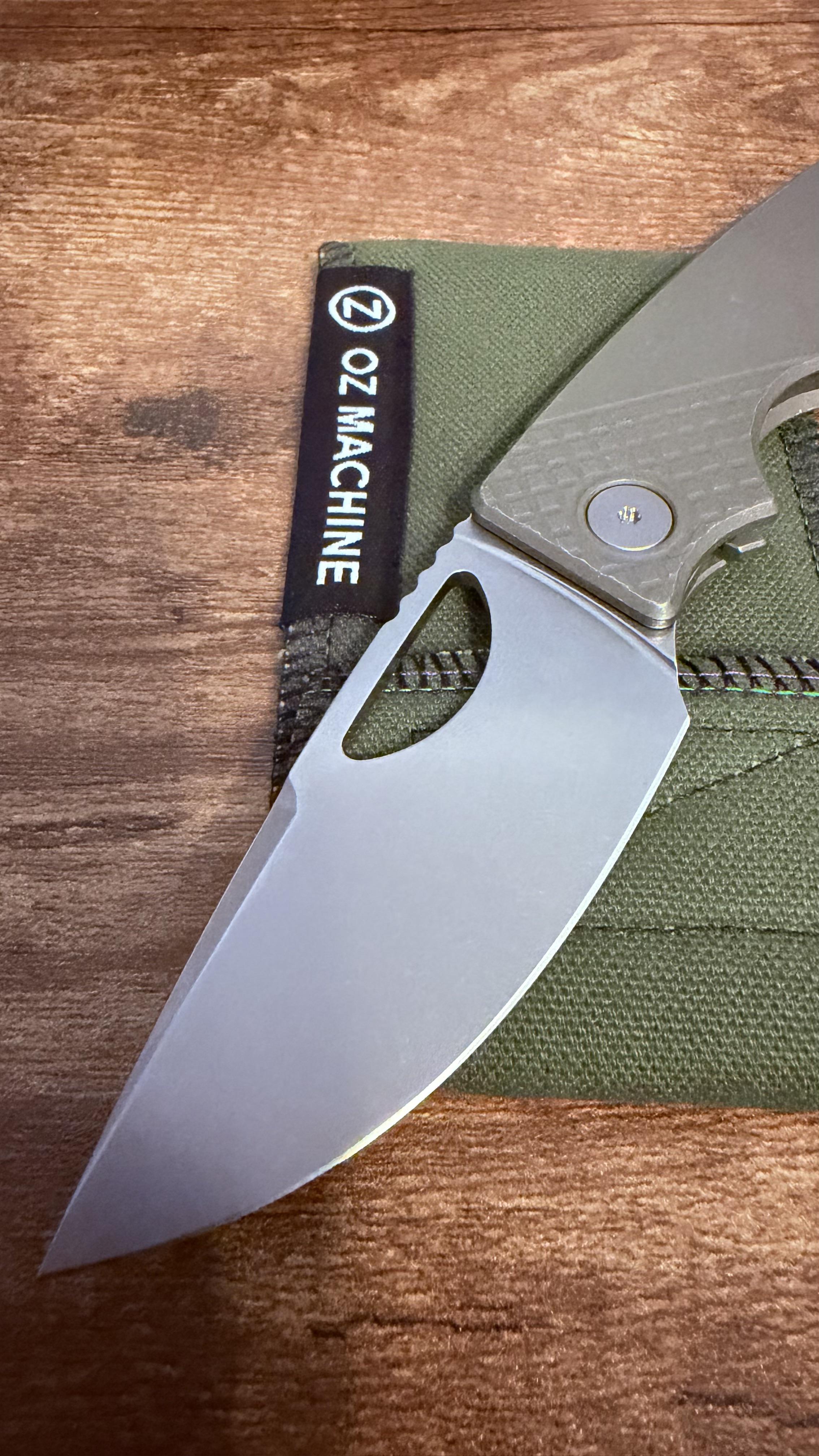 OZ Roosevelt: 62-63 HRC stonewashed S45VN blade, dark stonewashed crosshatch milled scales. Stonewashed clip, hardware and backspacer. All Titanium construction.