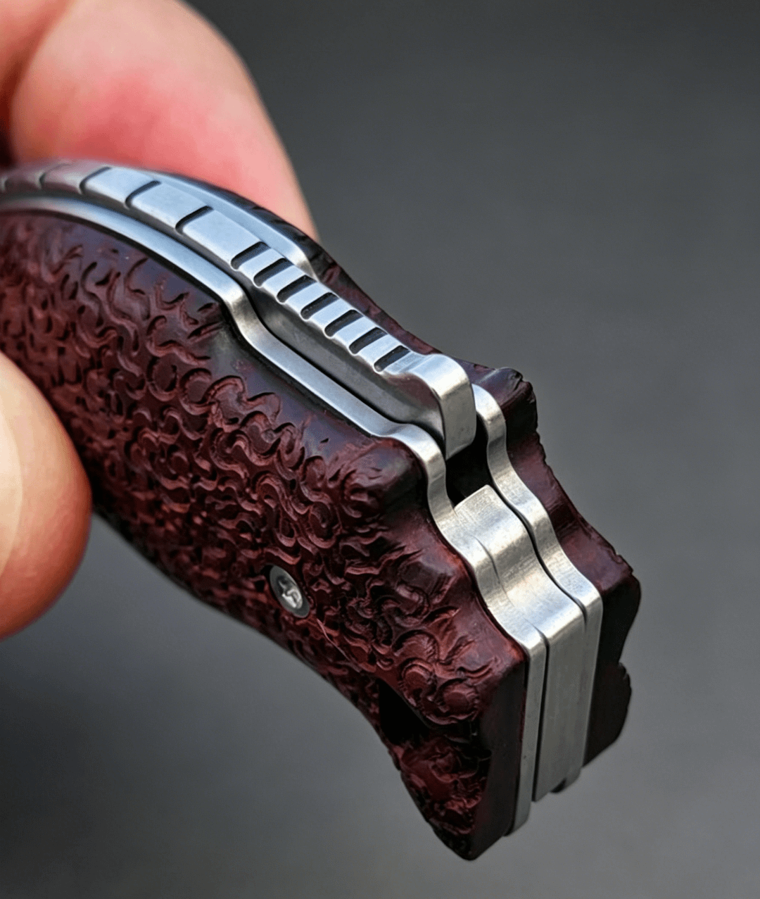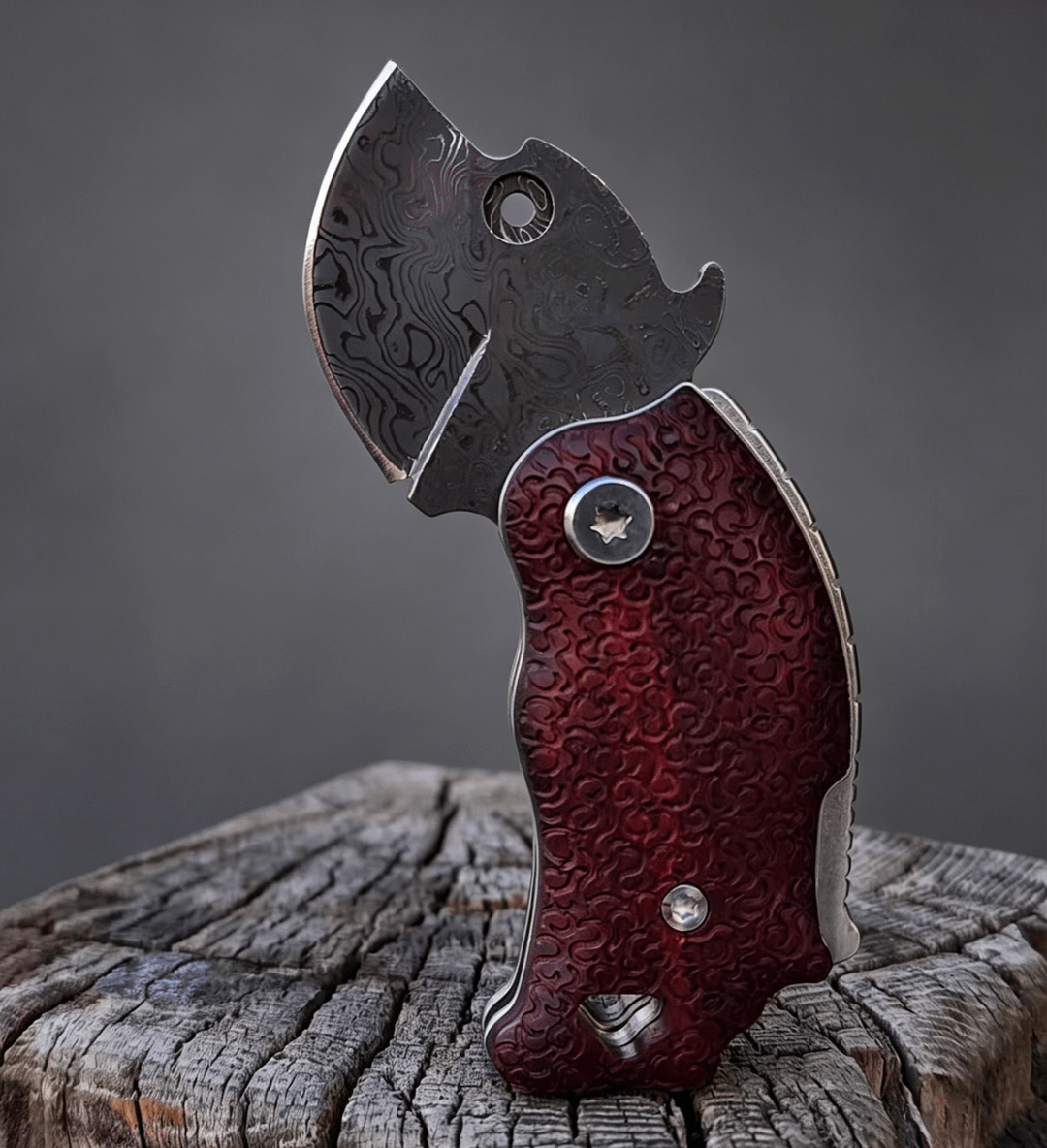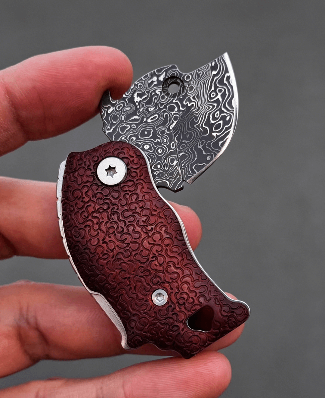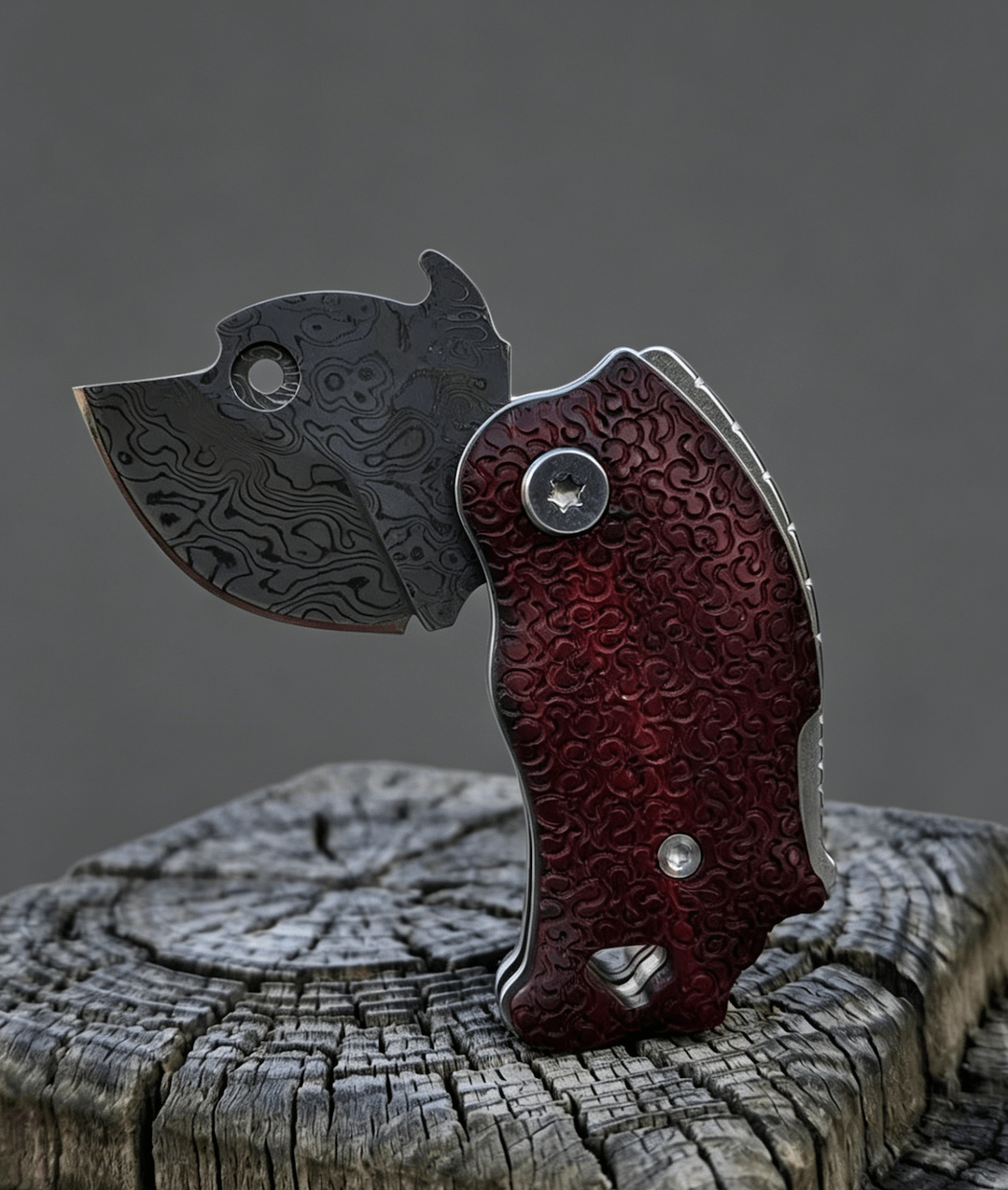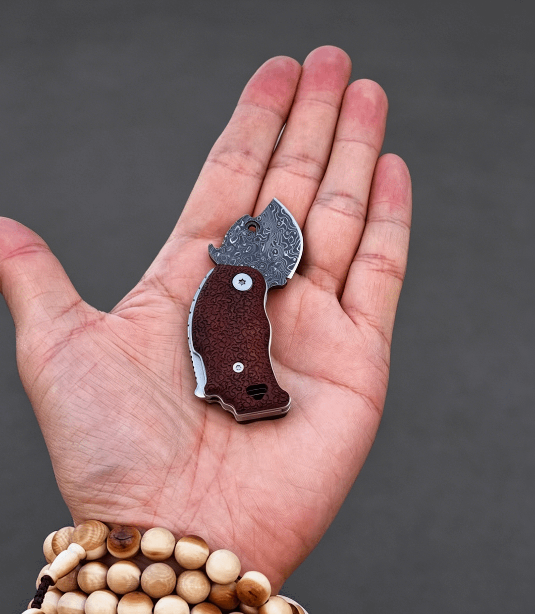 It's got the little eyes, a raised head, curly wooden fur, and a tiny tail. The craftsmanship is actually wild for something this small. The blade is 110-layer Damascus with a cloud forged pattern, paired with an aged Blood Sandalwood handle. It sits on dual ball bearings, and get thisβit features a custom back-lock design where you literally press the dog's "tail" to unlock the blade (the head).