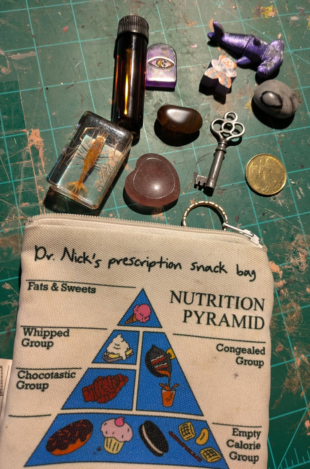 Pouch contents- perfume, angel coin, preserved shrimp, skeleton key, 3d printed hammerhead shark, wooden clown, worry stone, crystals (one was a gift and is supposed to be good for writers block, the other is the color of my husband's eyes)
