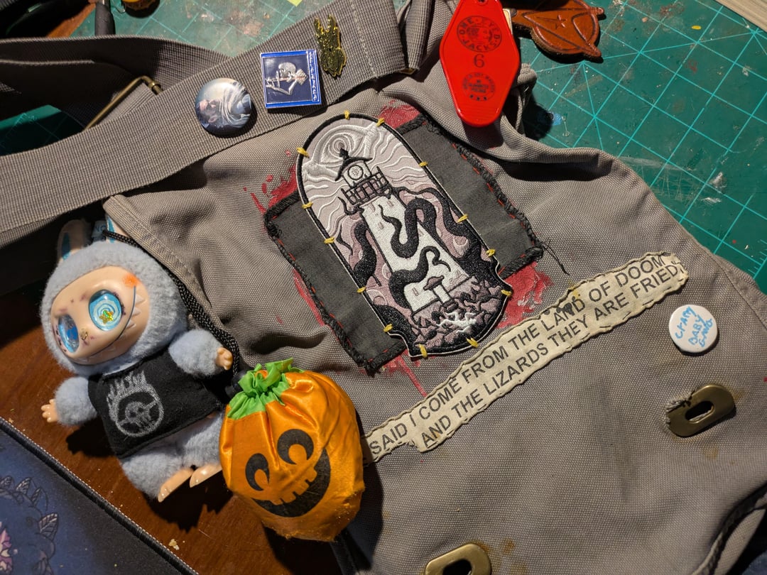 On my bag- keys, jack o lantern tote, knockoff labubu, pins (Duncan Idaho, a sword swallower from the ren faire, a beetle and a custom button that says "crappy baby gang"), patches from various sources