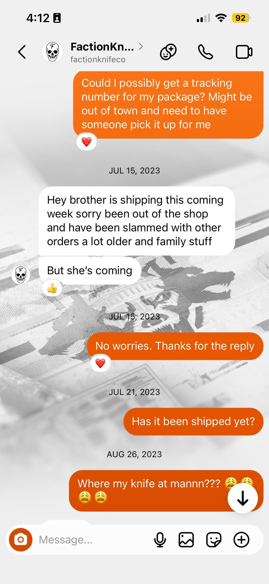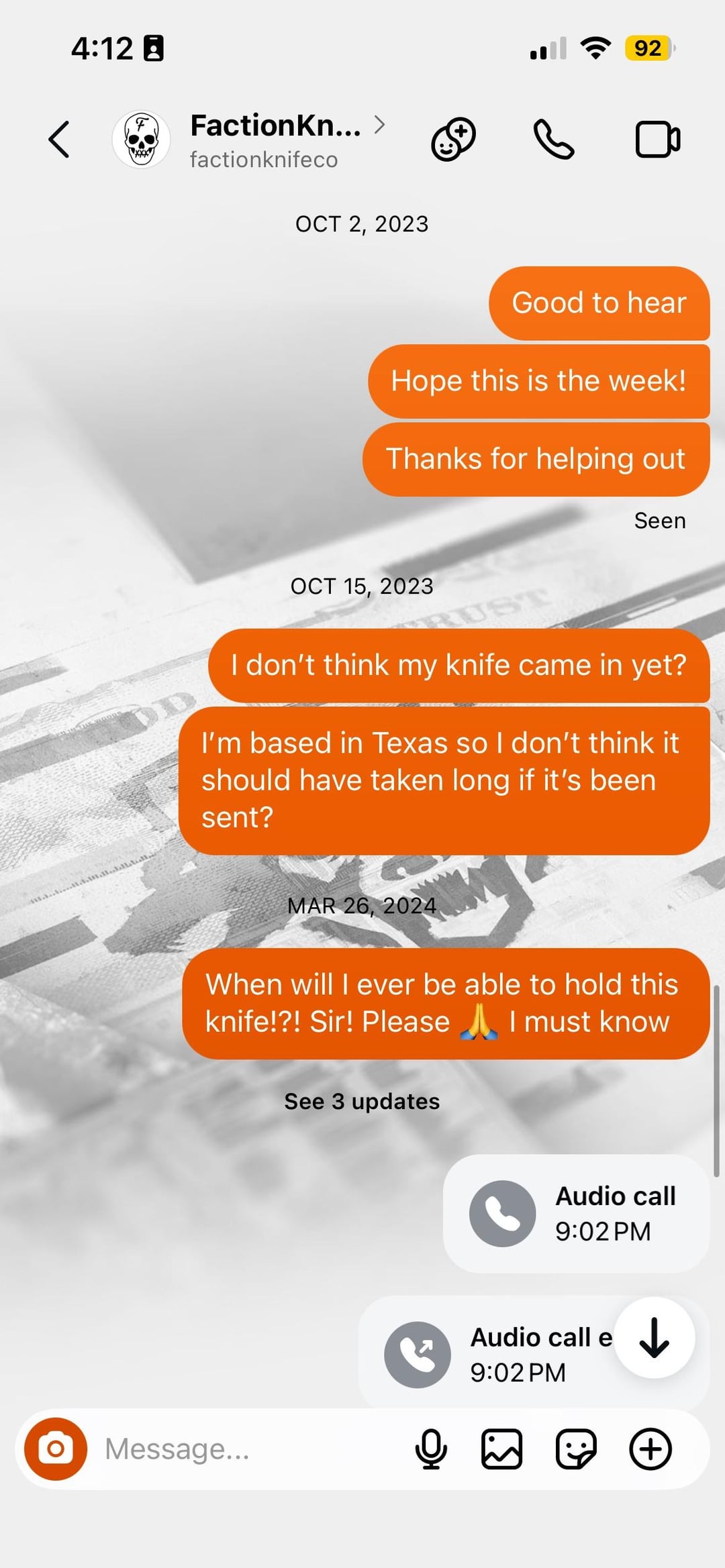 There have already been talks about this guy named Dustin Pugh that’s been scamming people out of their money and promises a quality knife. It’s been almost 3 years and I still not received my knife and probably never will. I’m just adding to the awareness for other others if they are considering purchasing from him. If you did purchase, immediately start a chargeback process because he will ghost you.