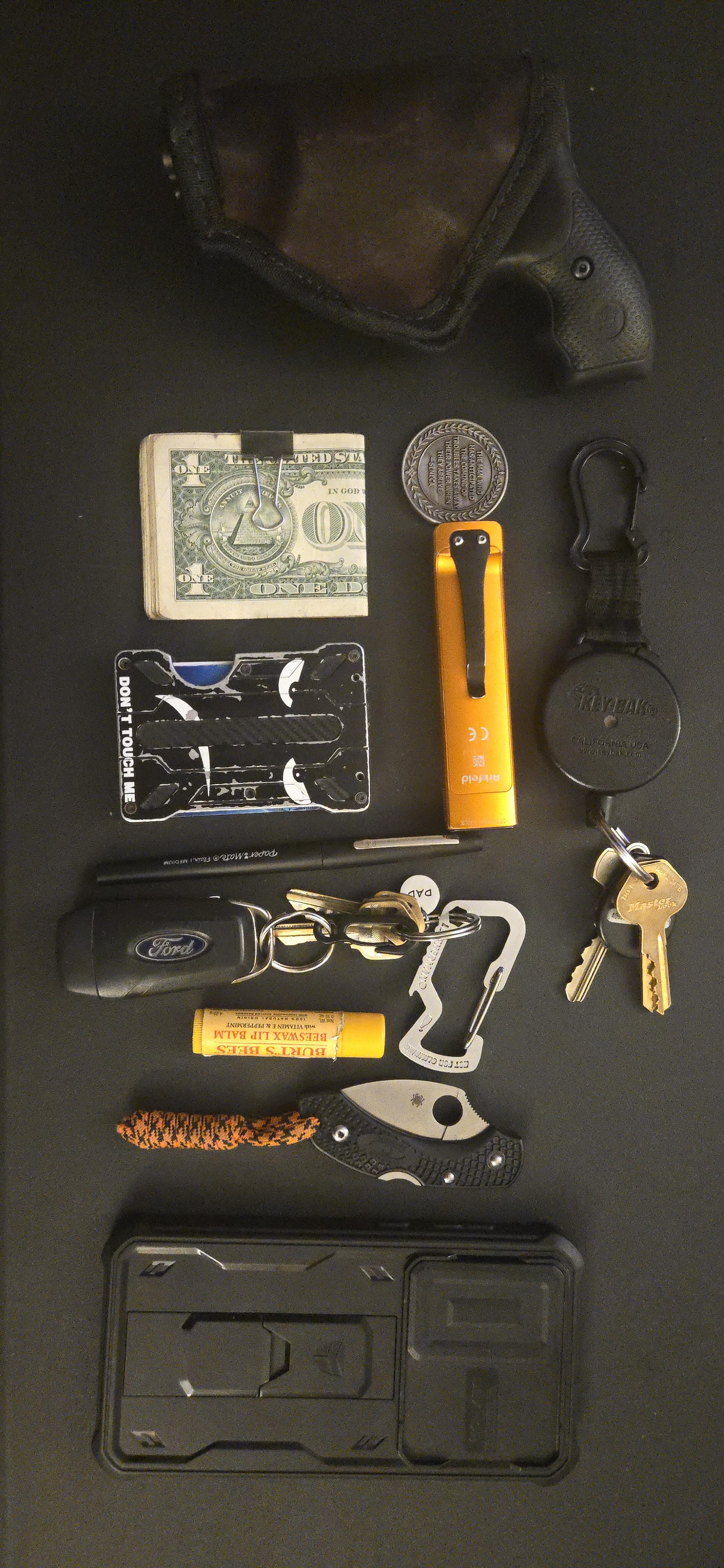 In EDC Pocket dump April 17, 2026 S&W Airweight Olight arkfield Work keys wallet Truck/house keys Burtsbees chapstick Challenge coin Pen Spyderco dragonfly (wharncliff) Cash Cellphone by Lurial EDC Prev Post Is this mora knife legit? April 17, 2026 Next Post Not everyone’s jam, but love the mirrored blade and DLC! April 17, 2026 Related Posts Today’s EDC April 23, 2026 Tactical iPad kit 😂 April 23, 2026 Upgrade compete! April 23, 2026 1 Comment AutoModerator 6 days ago Thank you for posting to r/EDC! Include a detailed item list (make/model) within **1 hour** of submission. Lists can go in the title, a comment, or the image. Posts without lists will be removed. If you have already provided a list, not further action is needed, thanks! [Rules](https://www.reddit.com/r/EDC/wiki/rules) | [FAQ](https://www.reddit.com/r/EDC/wiki/faq) *I am a bot, and this action was performed automatically. Please [contact the moderators of this subreddit](/message/compose/?to=/r/EDC) if you have any questions or concerns.* Write A CommentYou must be logged in to post a comment.