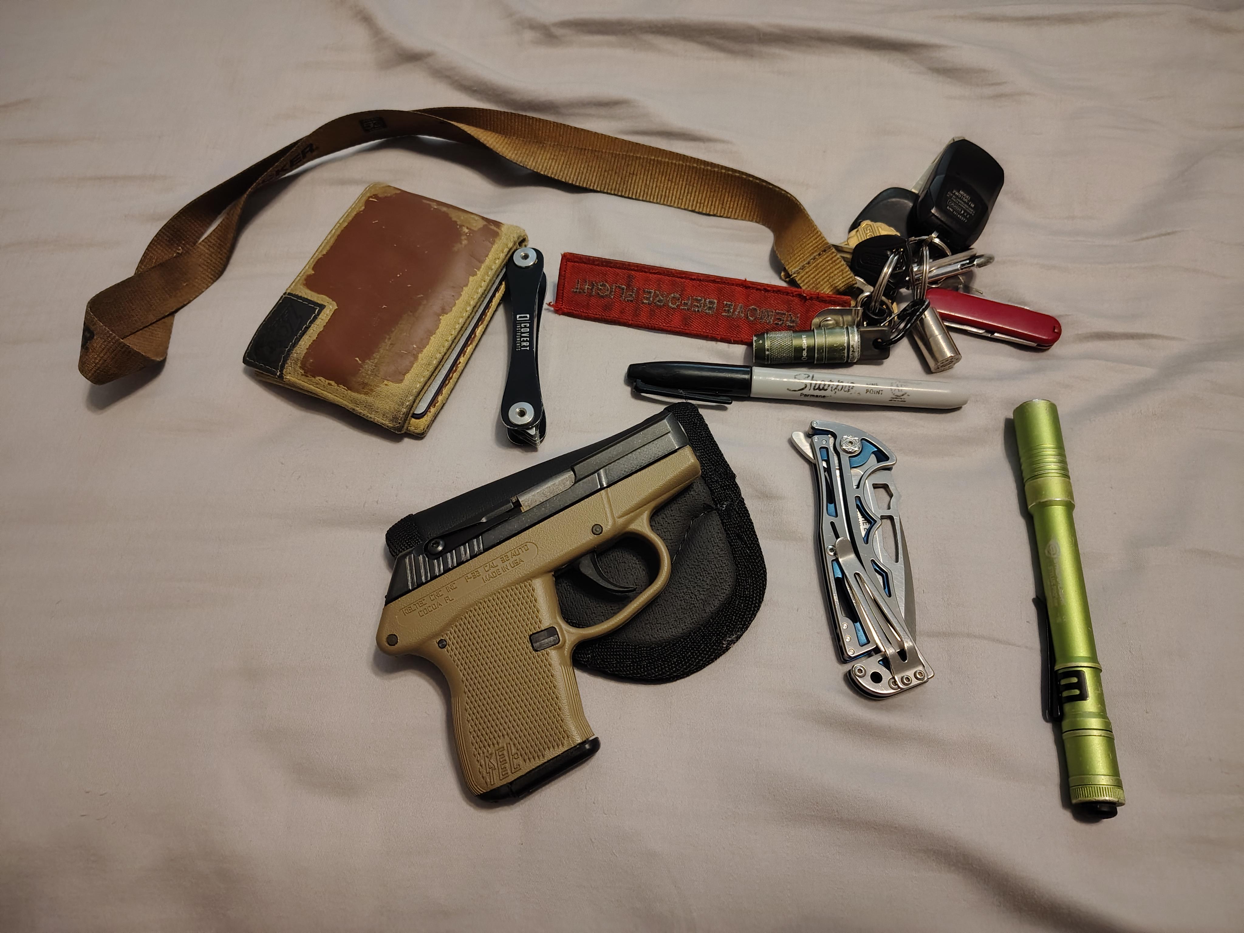 In EDC New pew April 17, 2026 Keltec P32, sticky holster CRKT Nirk Tighe Streamlight Stylus Pro Covert Instruments Slim Pickens Snap on faux leather wallet Sharpie key ring includes a very small lighter, an olight flashlight, and a mini Swiss army knife. by this_guy_aves EDC Prev Post First EDC, Bestechman Dundee Magnacut vs Kershaw Iridium April 17, 2026 Next Post New additions April 17, 2026 Related Posts Today’s EDC April 23, 2026 Tactical iPad kit 😂 April 23, 2026 Upgrade compete! April 23, 2026 1 Comment AutoModerator 6 days ago Thank you for posting to r/EDC! Include a detailed item list (make/model) within **1 hour** of submission. Lists can go in the title, a comment, or the image. Posts without lists will be removed. If you have already provided a list, not further action is needed, thanks! [Rules](https://www.reddit.com/r/EDC/wiki/rules) | [FAQ](https://www.reddit.com/r/EDC/wiki/faq) *I am a bot, and this action was performed automatically. Please [contact the moderators of this subreddit](/message/compose/?to=/r/EDC) if you have any questions or concerns.* Write A CommentYou must be logged in to post a comment.
