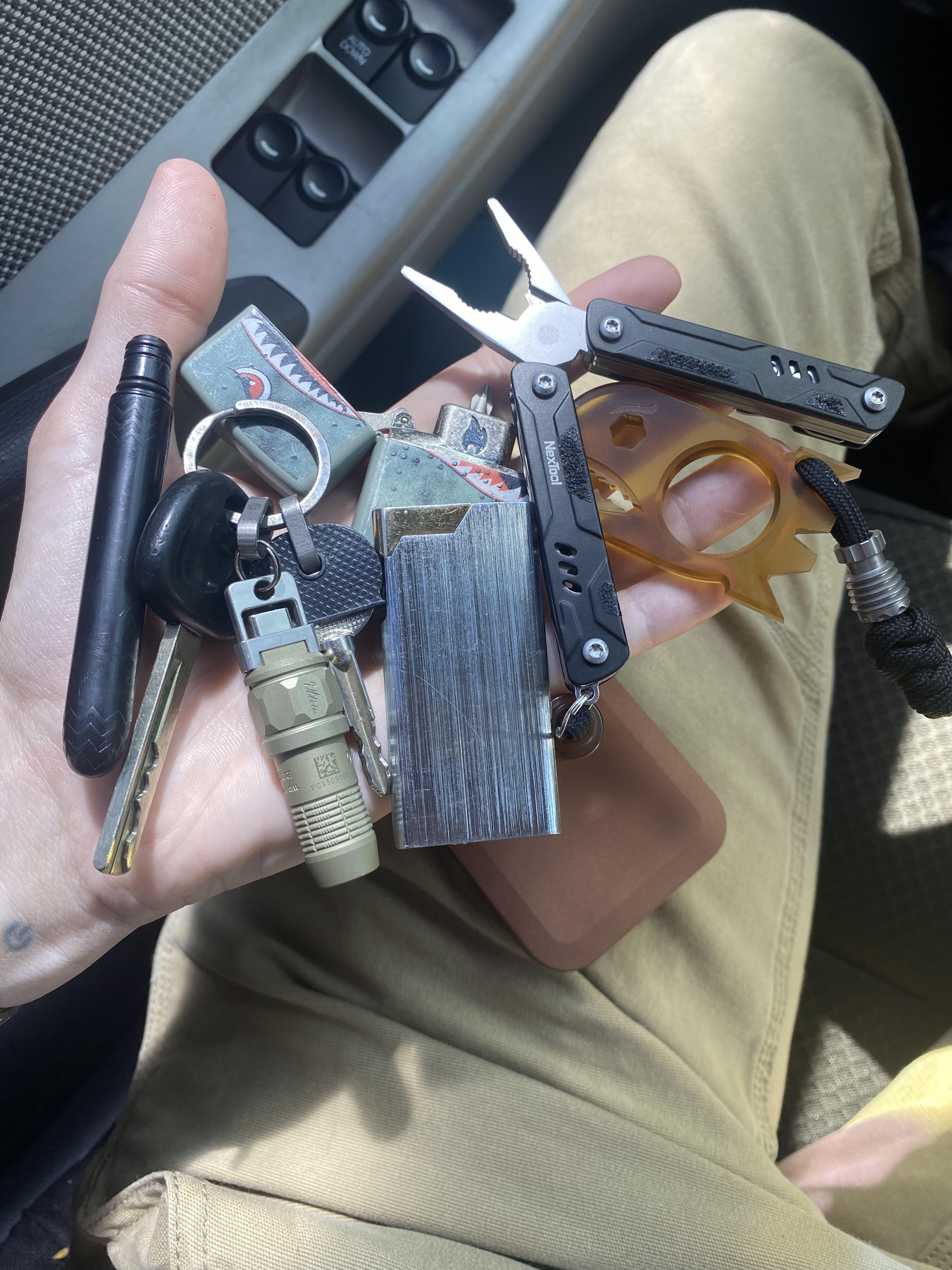 Pokka pen, car keys, olight ultra, vintage lighter, zippo bit driver, Nextool mini sailor, Amazon multi tool, aluminum zyn case