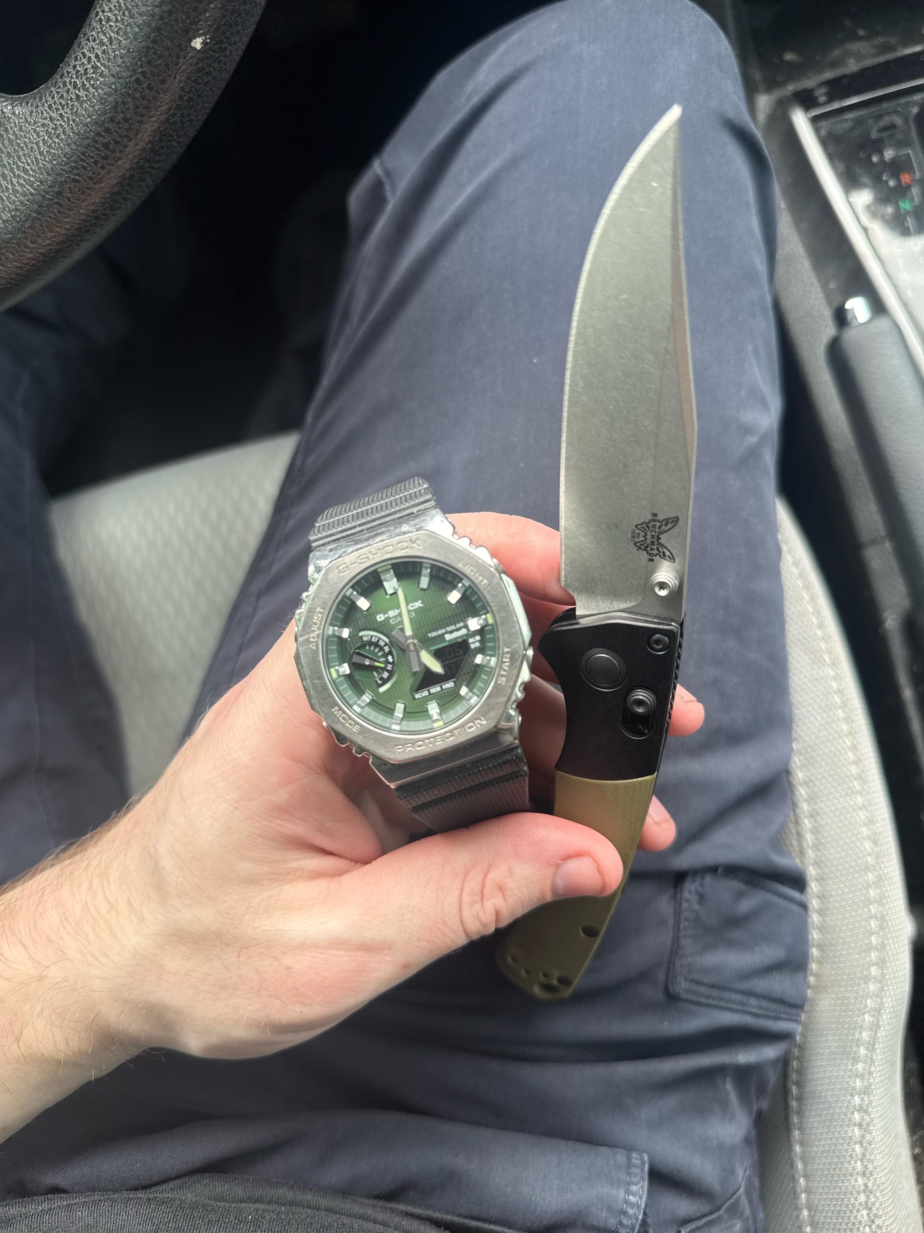 In EDC Green EDC April 17, 2026 All green EDC going strong. The knife was a gift I just received for helping a fried a couple years back. 💪G Shock GBM 2100Benchmade Mini Crooked River by Phil_Fowler EDC Prev Post My otf knives April 17, 2026 Next Post I have a drain-bug problem. I think I found a solution… April 17, 2026 Related Posts New knife day. Came home to the Parallel from Vosteed. When it is said that it is thin, it really is. April 22, 2026 Current Rotation April 22, 2026 Springtime adventure carry:) April 22, 2026 1 Comment AutoModerator 4 days ago Thank you for posting to r/EDC! Include a detailed item list (make/model) within **1 hour** of submission. Lists can go in the title, a comment, or the image. Posts without lists will be removed. If you have already provided a list, not further action is needed, thanks | [FAQ](https://www.reddit.com/r/EDC/wiki/faq)*I am a bot, and this action was performed automatically. Please [contact the moderators of this subreddit](/message/compose/?to=/r/EDC) if you have any questions or concerns.*Write A CommentYou must be logged in to post a comment.